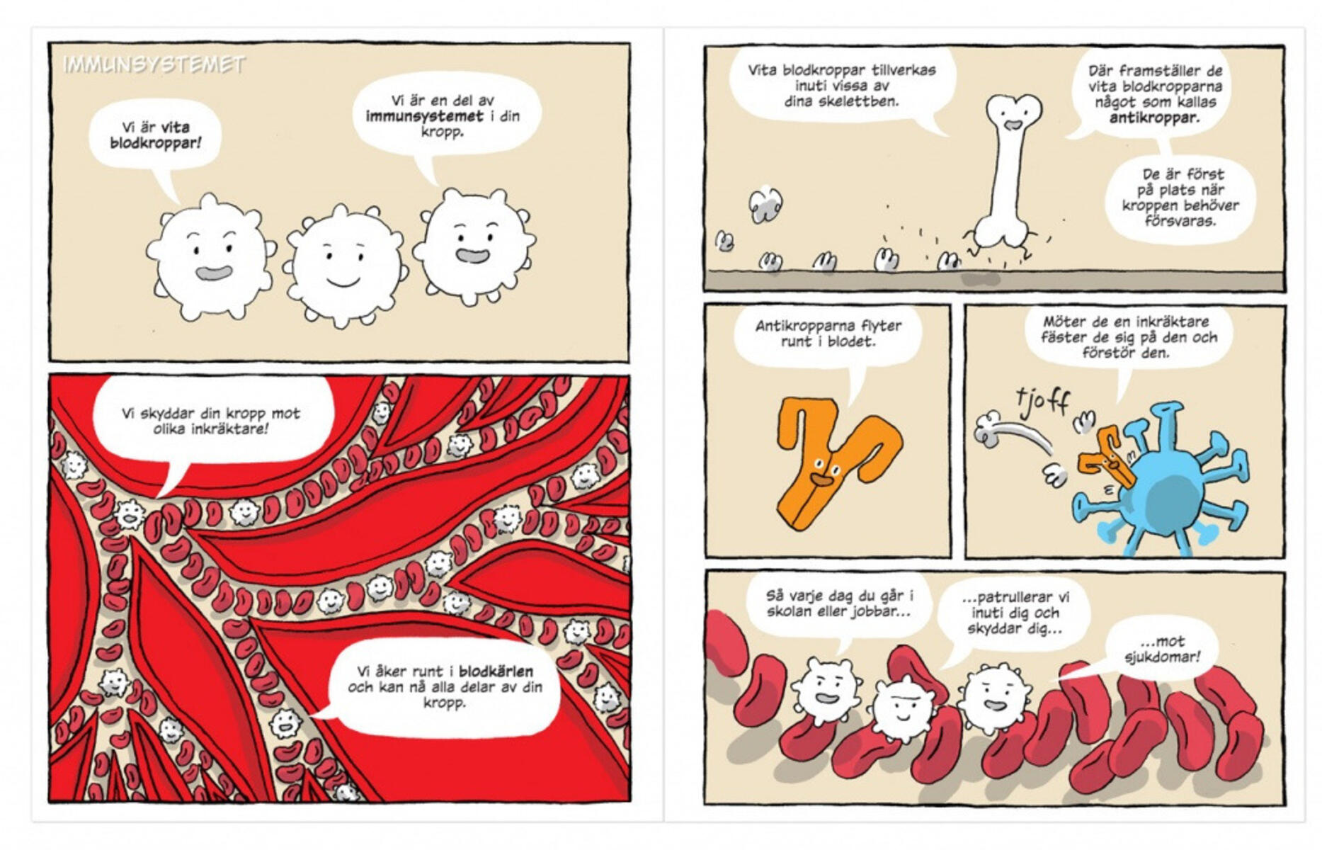Serietecknad bok om vita blodkroppar, antikroppar, virus och bakterier.