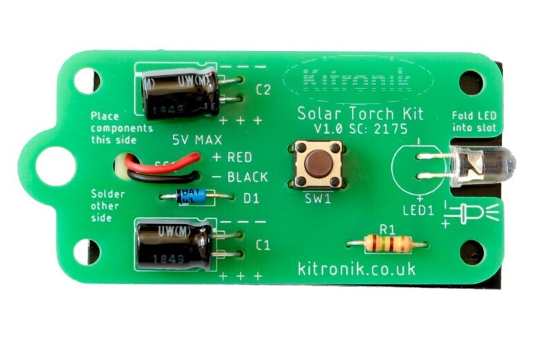 Ficklampan består av flera delar som tillsammans bildar en lärorik och spännande lödsats, perfekt för teknik- eller fysiklektioner. Byggsatsen visar tydligt hur solenergi omvandlas till elektricitet: solcellen laddar upp två kondensatorer som i sin tur driver en lysdiod när tryckströmbrytaren aktiveras. En inbyggd diod skyddar solcellen från urladdning. Efter bara fem minuters laddning i starkt solljus kan ficklampan lysa i 5 – 10 minuter. Obs! Lödning krävs. Den färdiga Solcells-ficklampan kan bäras på en nyckelring.
