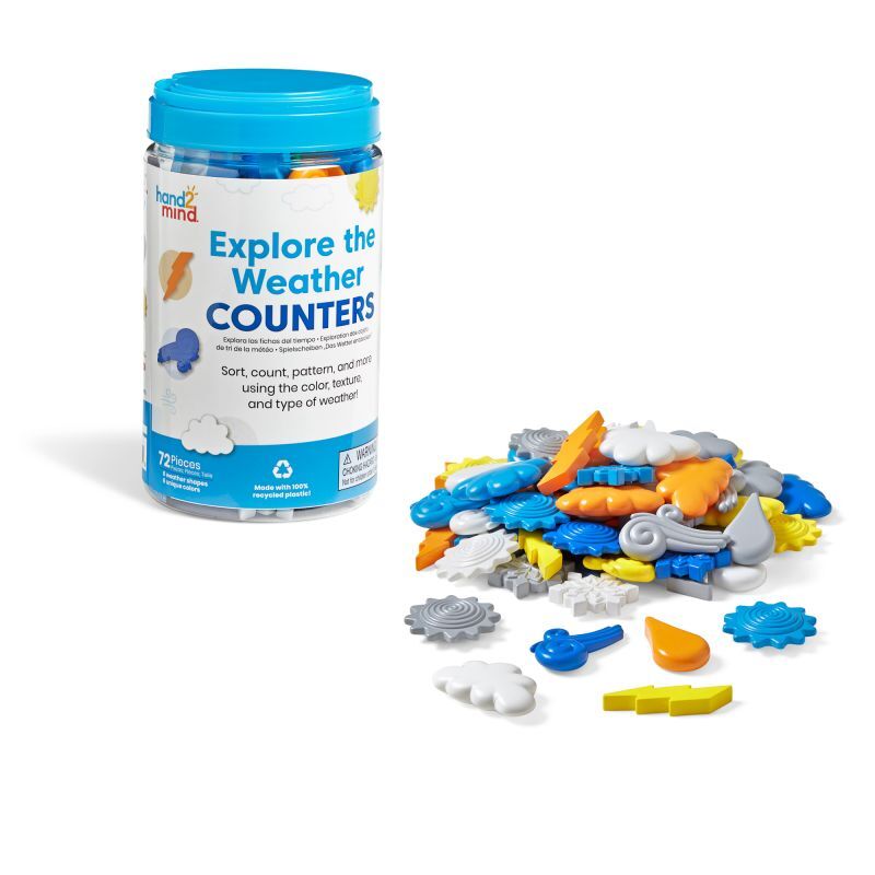 72 st. Sortera 6 olika väderfenomen (regndroppe, sol, snöflinga, blixt, moln och vind). Öva på att sortera, räkna, gruppera och skapa mönster. Det går även bra att göra avtryck i lera. Av 100 % återvunnen plast. Mått: ca 4 cm. Från 3 år.