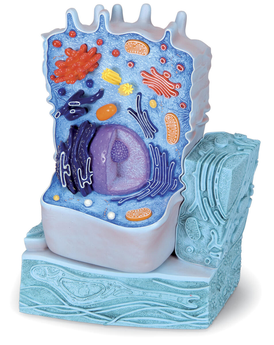 Denna tvådelade djurcellsmodell visar formen och strukturen hos en typisk djurcell sett med ett elektronmikroskop. Alla viktiga organeller visas i upphöjd relief samt i färg, t.ex kärna, mitokondrier, slät endoplasmatisk retikulum, grovt endoplasmatiskt retikulum, basalmembran, kollagenfibrer, golgiapparat, microvilli och lysosom. Förstoring: ca. 10 000: 1. Mått: ca. 21x11x31 cm. Vikt: ca. 800 g.
