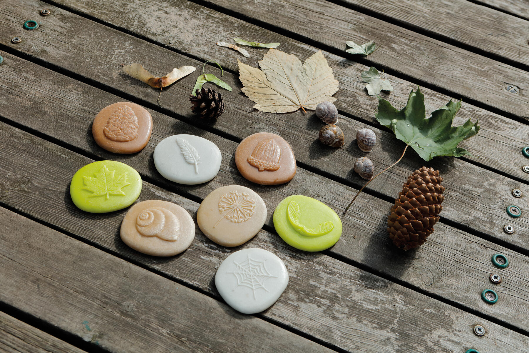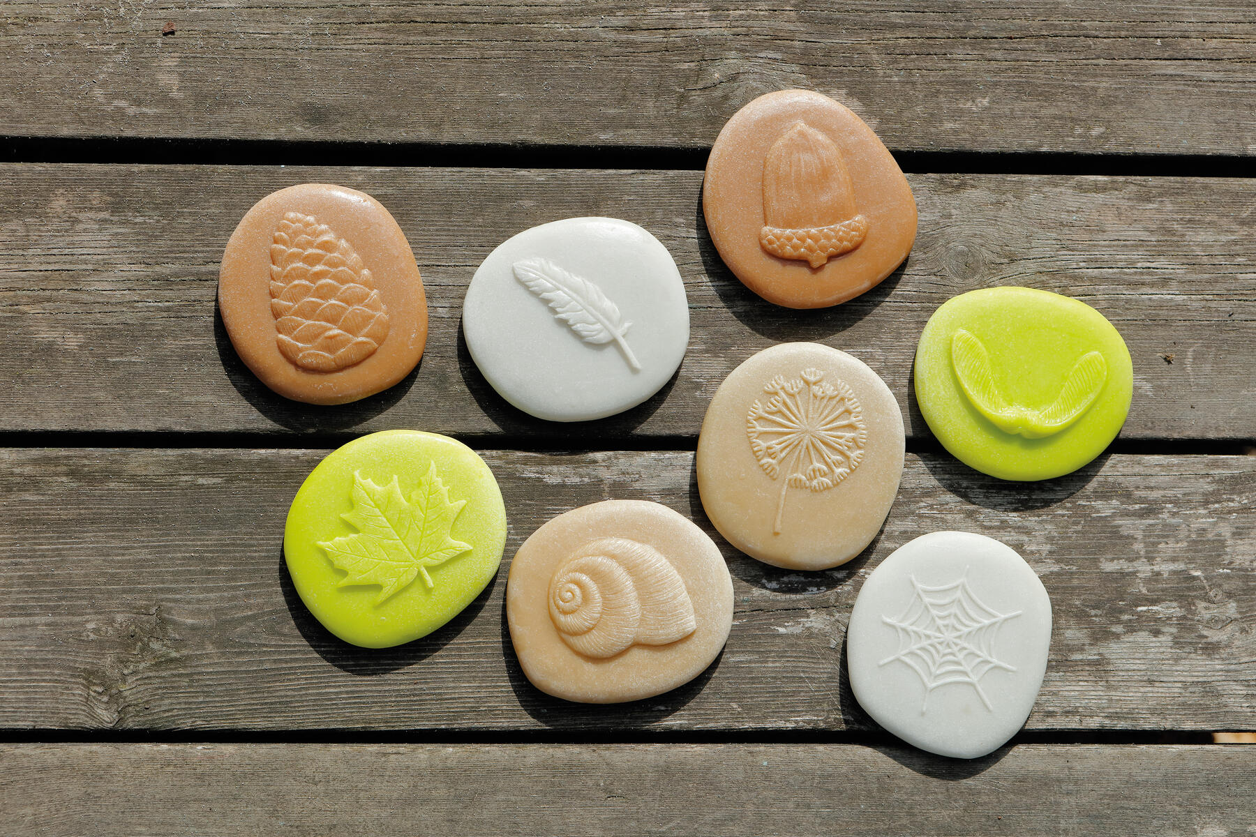 8 st/fp. Vackra, taktila stenar som visar naturens skatter. De passar allra bäst i naturen men fungerar bra inomhus också. Kan användas i vatten, lera, jord och i leklera och är lätta att rengöra. Detaljerna både känns och syns tydligt. Innehåller: ekollon, tallkotte, snäckskal, spindelnät, lönnlöv, lönnträdsfrö, fjäder, maskrosfrön. Mått: ca 80 mm. Av stenmaterial. PVC-fri. Från 2 år.