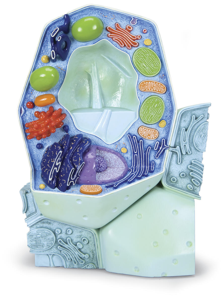 Denna tvådelade växtcellsmodell visar strukturerna hos en typisk växtcell sett med ett elektronmikroskop. Cytoplasman och alla viktiga organeller i växtcellen är i upphöjd relief samt visas i färg. Funktioner som ingår i modellen: cellvägg, cellmembranet, kärna, slät endoplasmatisk retikulum, grovt endoplasmatiskt retikulum, ribosomer, kloroplaster, mitokondrier och diktyosomer/Golgi-apparater. Mått: 20x11.5x33 cm. Vikt: 1,461 kg.