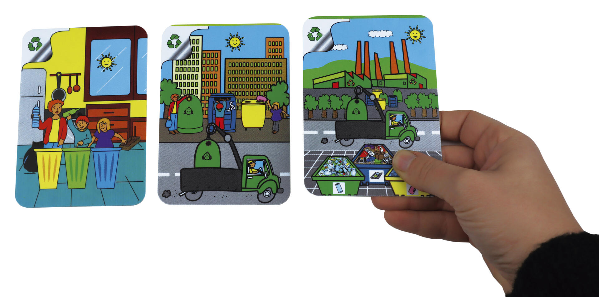 Sekvenser som hjälper barn att uppskatta återvinning och förstå vad materialet vi återvinner blir, samt processen kring återvinning i några steg. Stora kort.