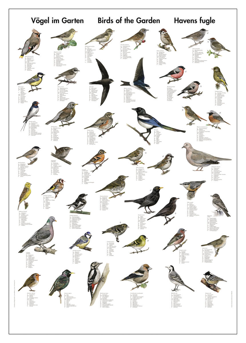 Visar 32 av de vanligaste fåglarna. Mått: 70x100 cm. Namnen på fåglarna på 14 språk: danska, engelska, tyska, spanska, franska, finska, italienska, isländska, norska, holländska, portugisiska, ryska, svenska och latin.