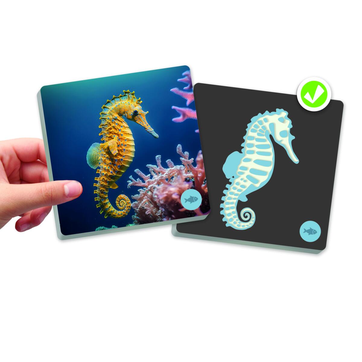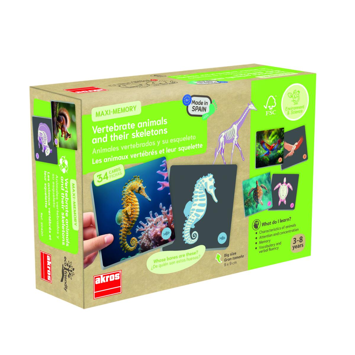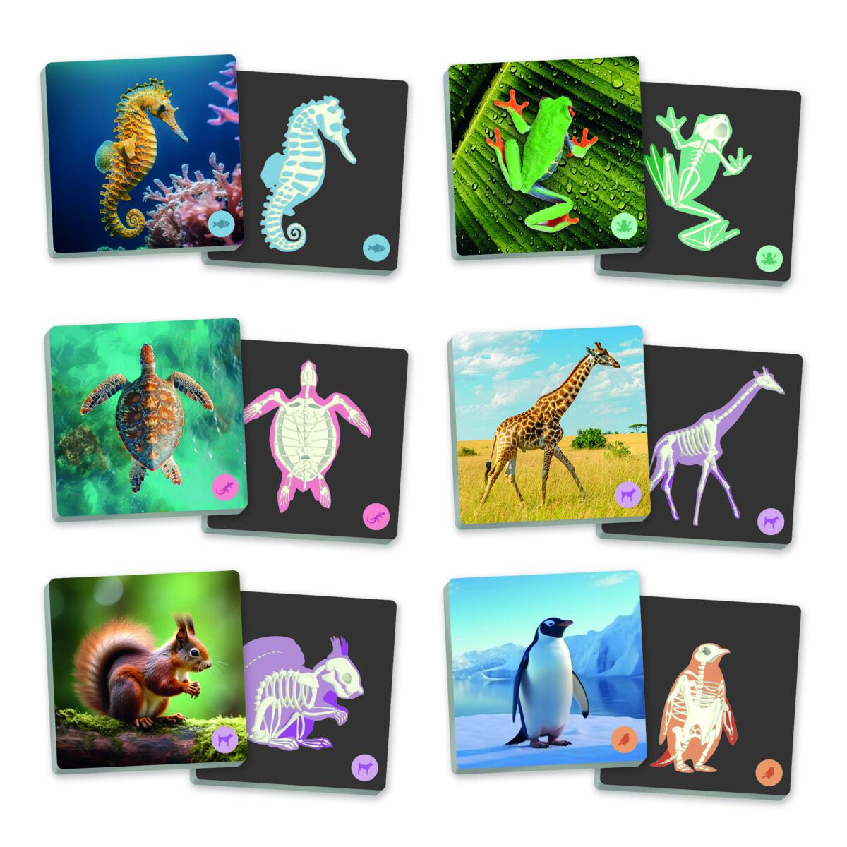 På ena kortet finns ett djur och på det andra djurets skelett. Barnen tränar minnet och att se skillnader på djurgrupper. 34 kort. Mått: 9x9 cm. Av FSC. Rekommenderas för åldrarna från 3-8 år. Utan PVC. Från 3 år.