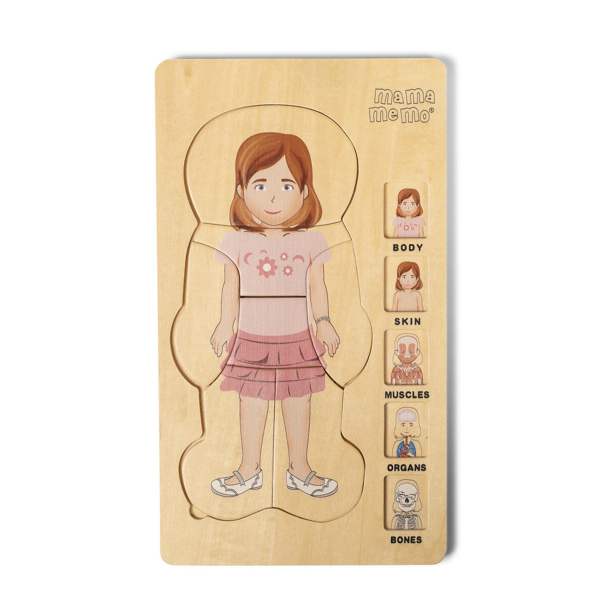 Ett mycket pedagogiskt träpussel i 5 lager. Visar kroppen i olika lager från skelett, inre organ, muskler och den nakna kroppen till kläder. Varje lager är märkt med en siffra på baksidan. Av FSC-märkt trä. PVC-fri.Från 3 år.