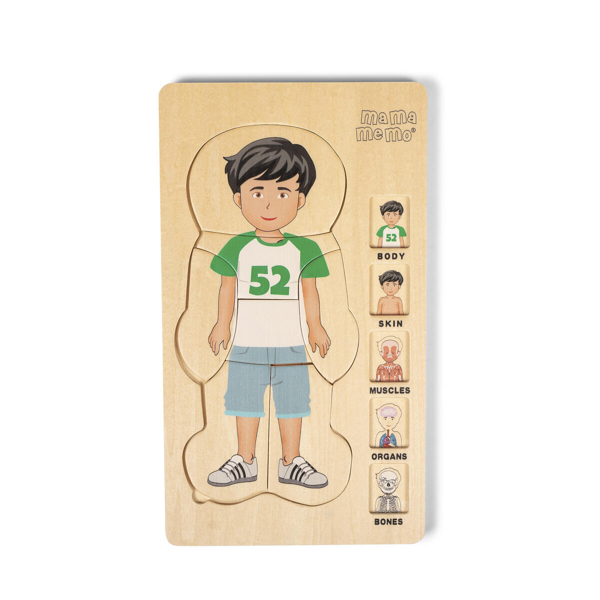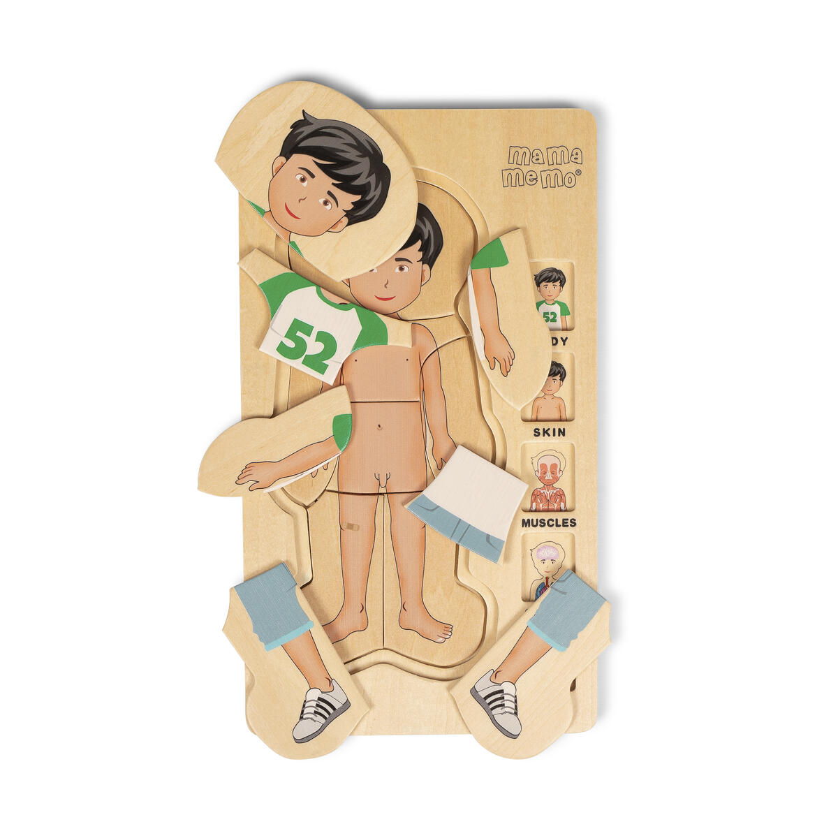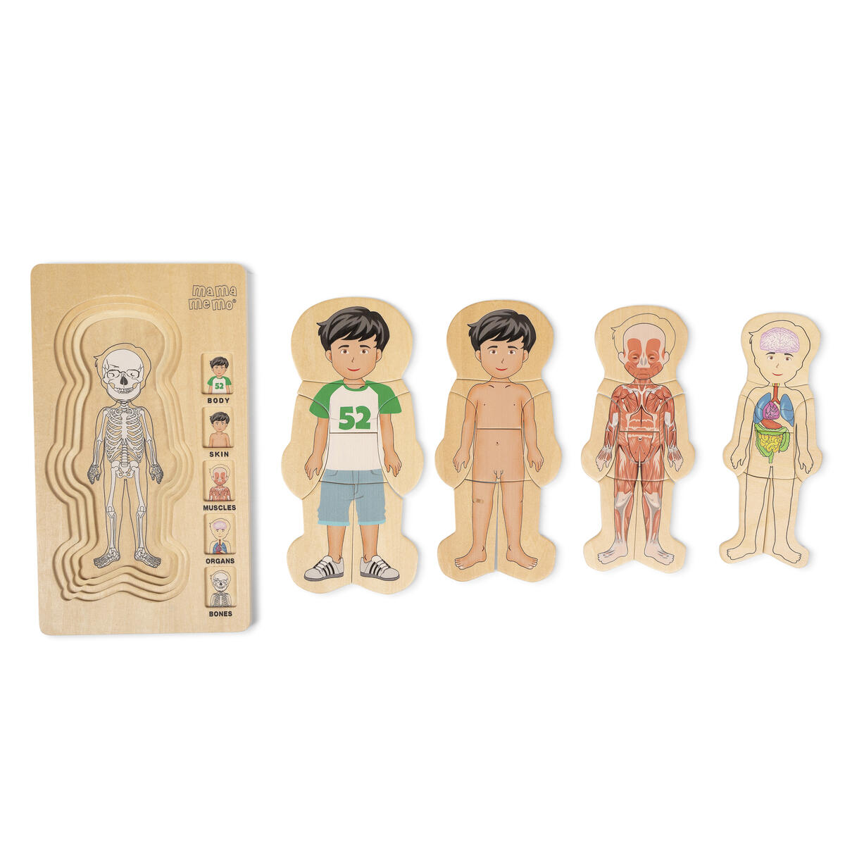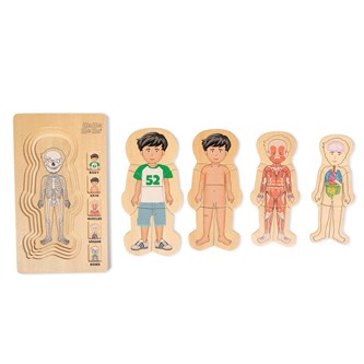 Ett mycket pedagogiskt träpussel i 5 lager. Visar kroppen i olika lager från skelett, inre organ, muskler och den nakna kroppen till kläder. Varje lager är märkt med en siffra på baksidan. Av FSC-märkt trä.PVC-fri. Från 3 år.
