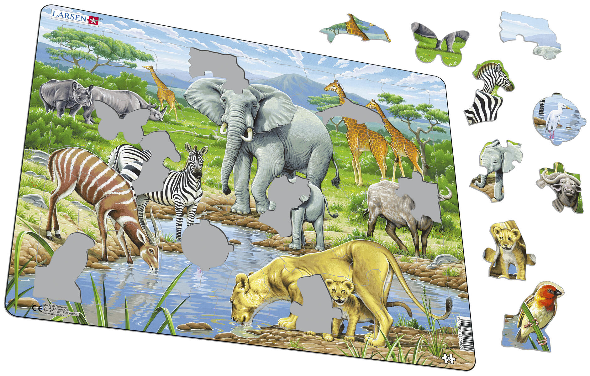 35 bitar. Detaljrikt pussel med stansade bitar som får formen som ett djur och andra kända karaktärer. Bitarnas form återfinns även i pusselramen för att barnen lättare ska hitta dess plats. Tjocka och solida bitar av kraftig FSC-märkt återvunnen kartong. PVC-fri. Från 3 år.