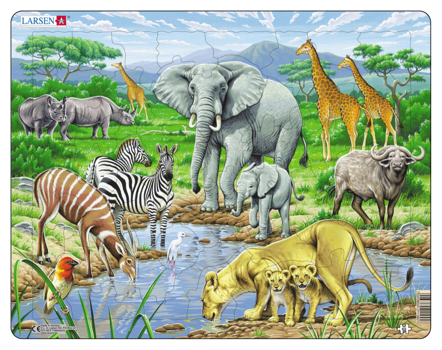 65 bitar. Detaljrikt pussel med stansade bitar som blir djur och andra kända karaktärer. Bitarnas form återfinns även i pusselramen för att barnen lättare ska hitta rätt plats. Tjocka och solida bitar av kraftig FSC-märkt återvunnen kartong. PVC-fri. Från 3 år.