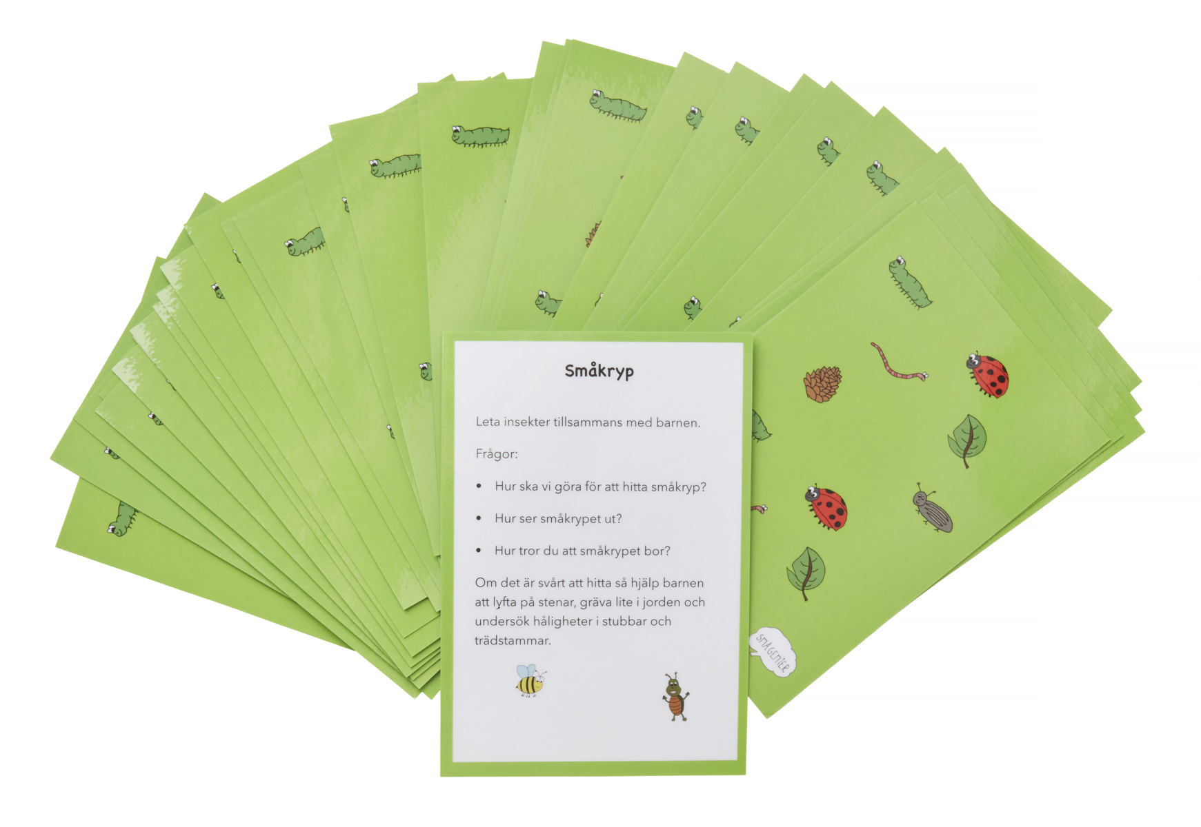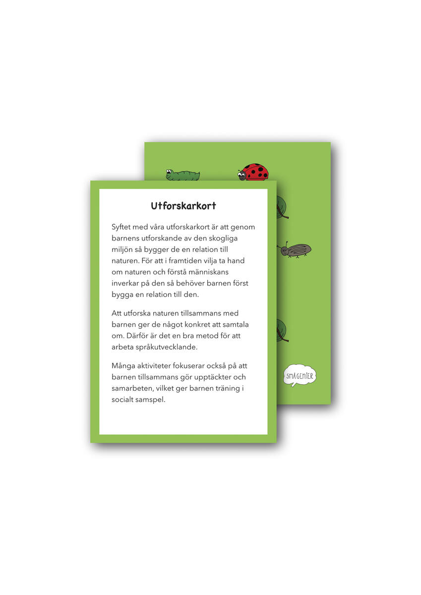 Praktiska utforskarkort som man alltid kan ha med sig ut i skogen, parken eller gården. En utforskande aktivitet att genomföra utomhus på varje kort och förslag på frågor att ställa till barnen. Passar alla åldrar i förskolan.