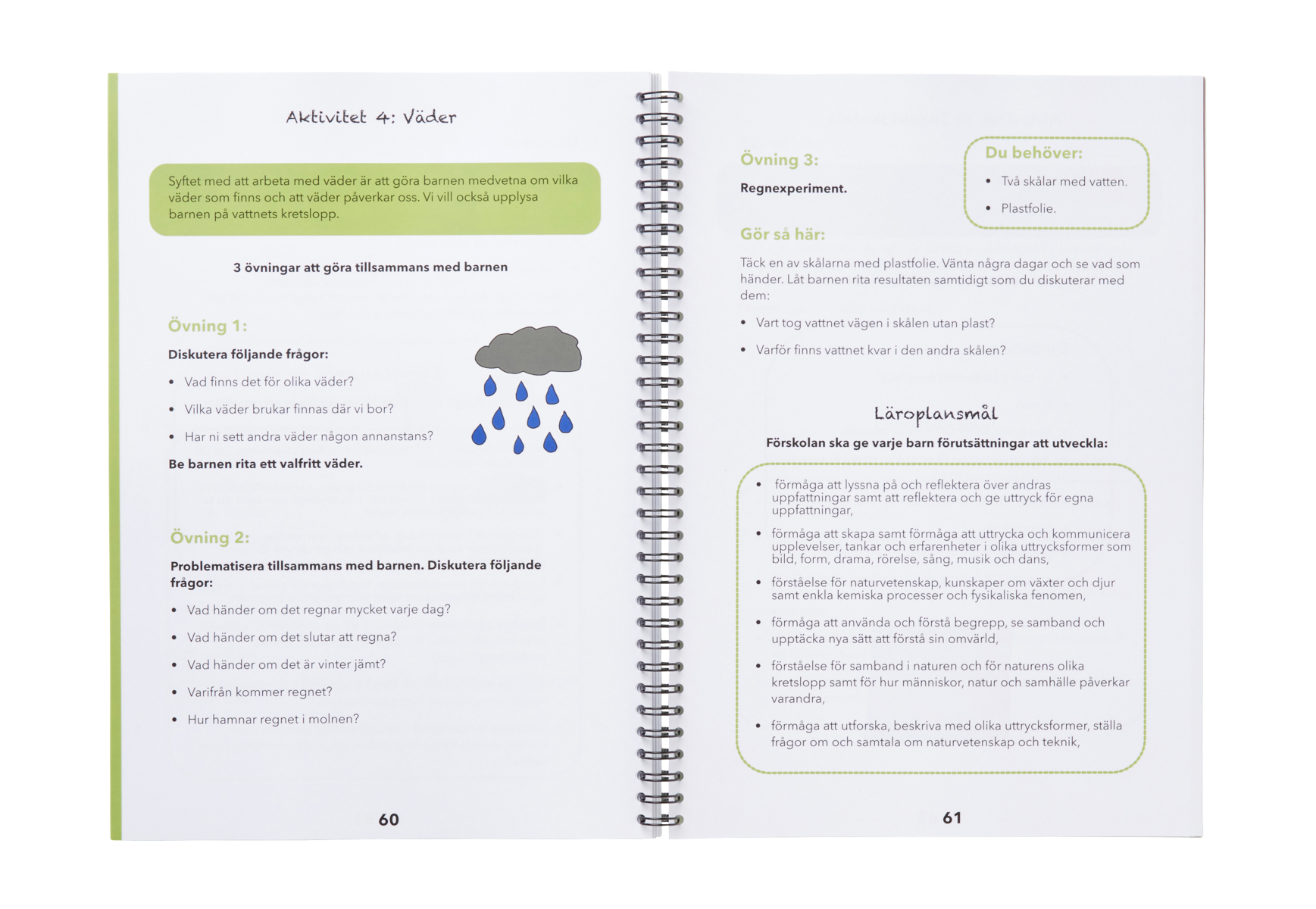 En lärarhandledning för förskolans pedagoger, med totalt 30 olika aktiviteter inom hållbar utveckling. I läroplanen har man avsatt ett helt stycke för just hållbar utveckling. Där står det bl.a. att barnen ska utmanas och stimuleras i sina intressen och kunskaper om natur och samhälle. Undervisningen ska präglas av en positiv framtidstro och barnen ska lära sig hur man bidrar till en hållbar utveckling. Aktiviteterna är uppdelade på tre åldersnivåer och det finns 10 aktiviteter per nivå. De tre olika åldersnivåerna är liten 1-2 år, mellan 2-4 år och stor 4-6 år.