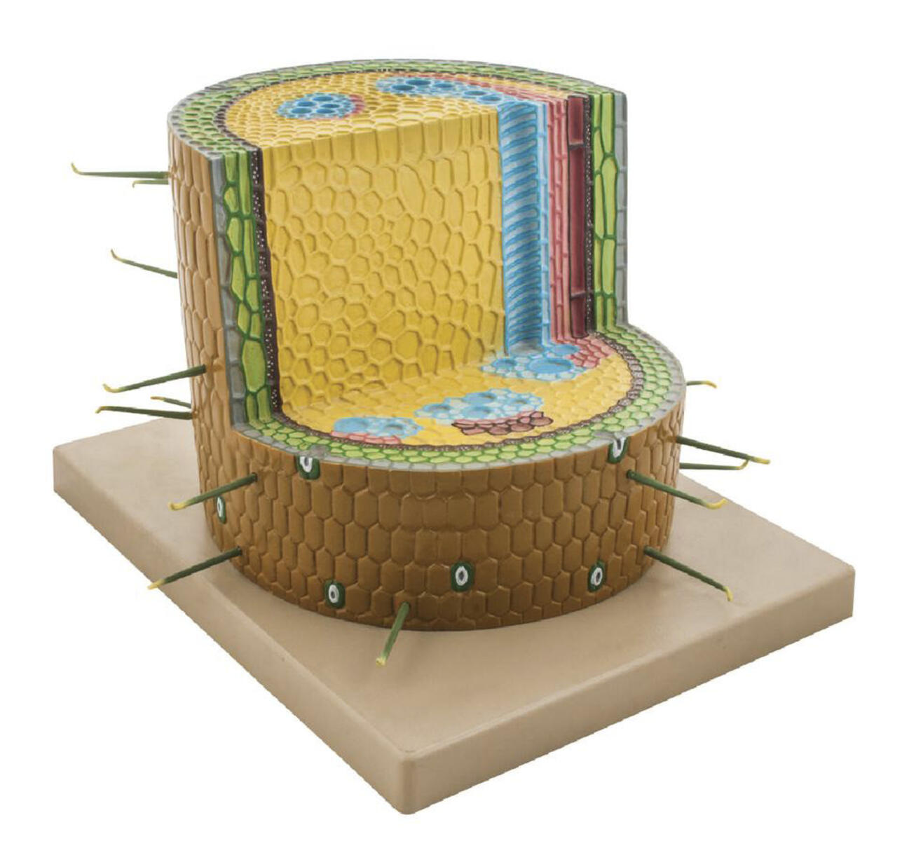 Modell som visar en tvåhjärtbladig växtstjälks olika delar, förstoring 200x.