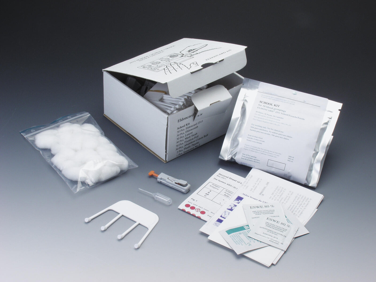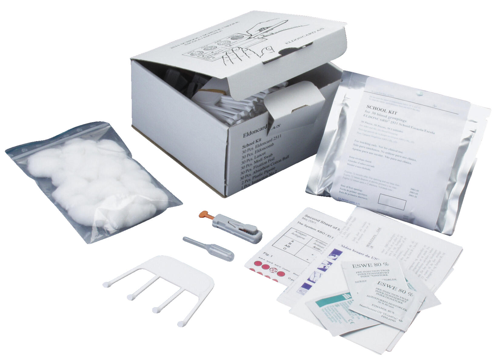 För bestämning av blod- och RH-grupper för 30 personer. Lättanvänt. Innehåller allt som behövs inklusive lansetter och desinfektionsutrustning. Färdigt inplanterat serum i korten. Blodprovet droppas på kortet med en utbredningsspatel. Ger resultat på tre minuter. Såret rengörs och vårdas med medföljande bomull och desinfektionsmedel. Eleverna kan teckna initialer och bevara kortet.