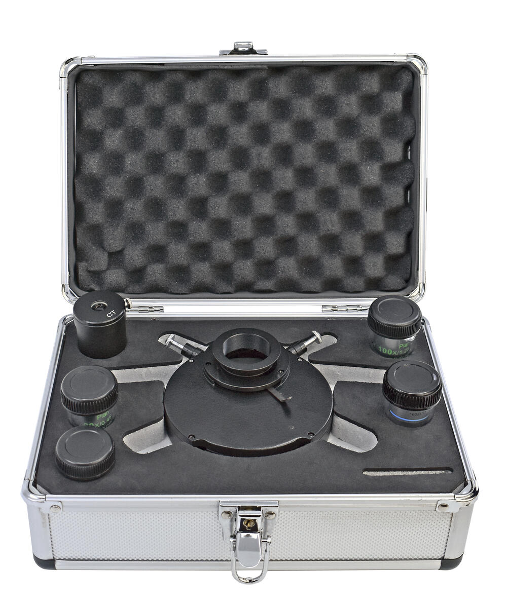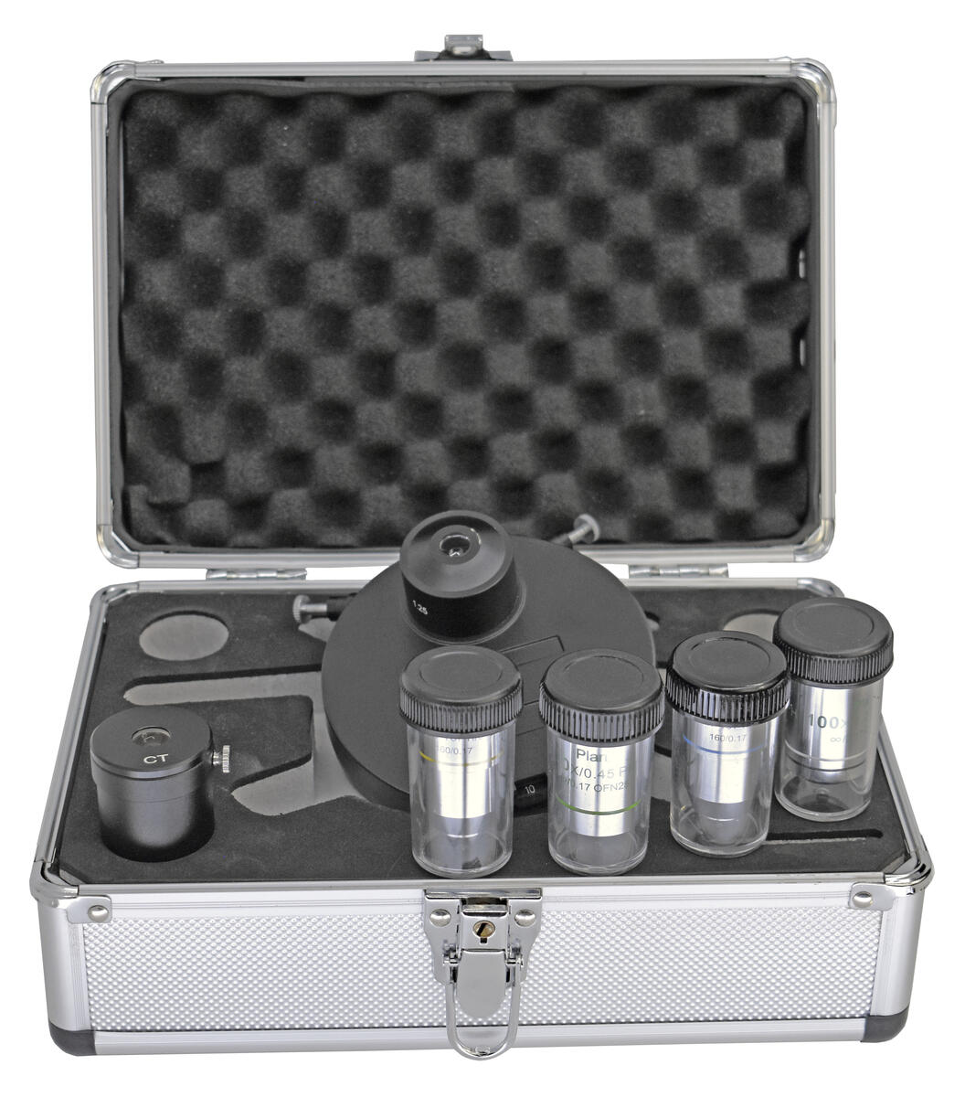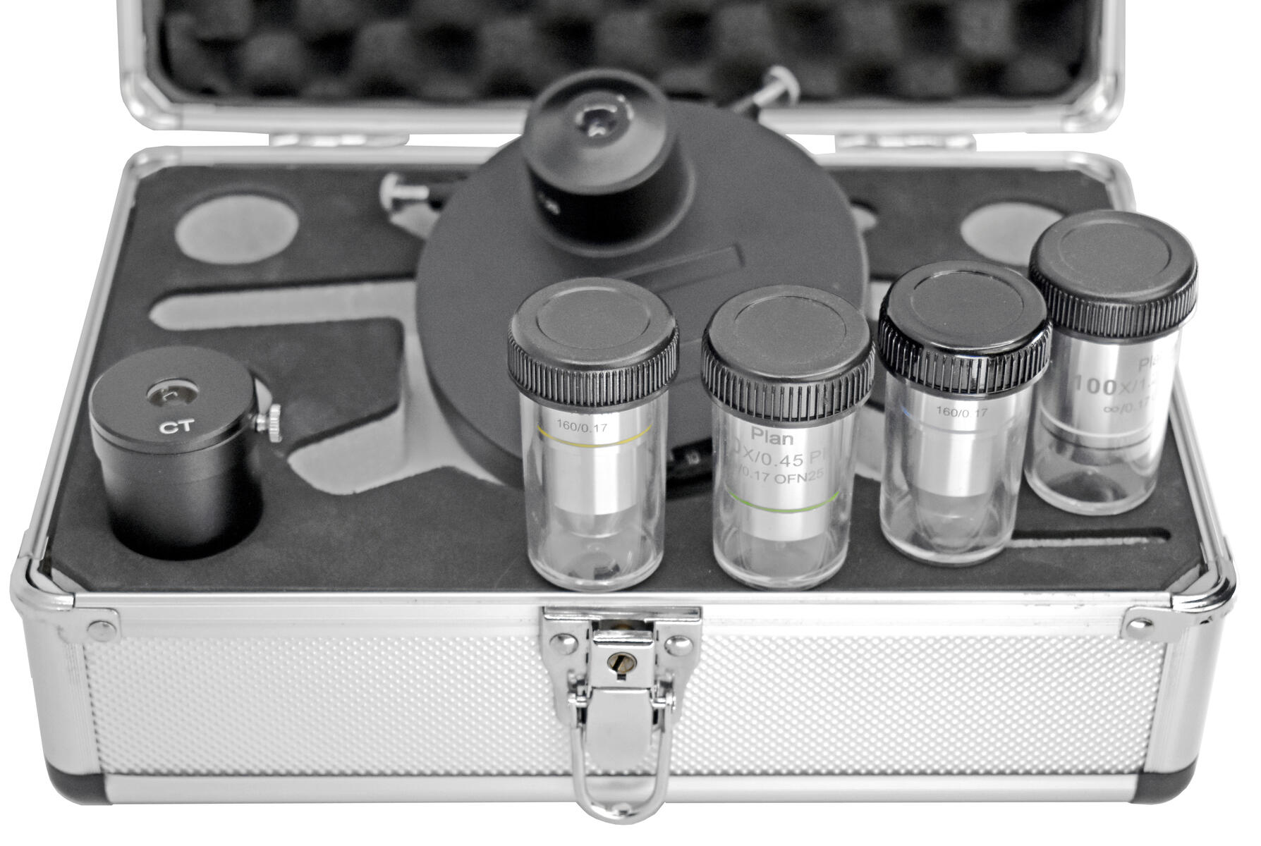 Mikroskop med trinokulärt huvud, 4 st högupplösta objektiv och två bredfältsokular (WF) inklusive planoptik som ger färgglada och tydliga bilder med hög kontrast. Den integrerade X-Y-preparathållaren är enkel att använda tack vare de ergonomiskt placerade koaxialkontrollerna. Abbe-kondensorn är lätt att byta ut mot olika tillbehör som mörkfälts- eller faskontrastkondensorer. Kondensorn kan justeras i höjdled med hjälp av kuggstångssystemet. Alla optiska ytor (okular och objektiv) är belagda med ett antisvampskikt. Den nya generationens LED-belysning ger komfort och vila för ögat. Lysdiodens spektrum är lika med naturligt dagsljus och är justerbar i intensitet. LED-ljuskällan är jämförbar med en 30 W halogenljuskälla.