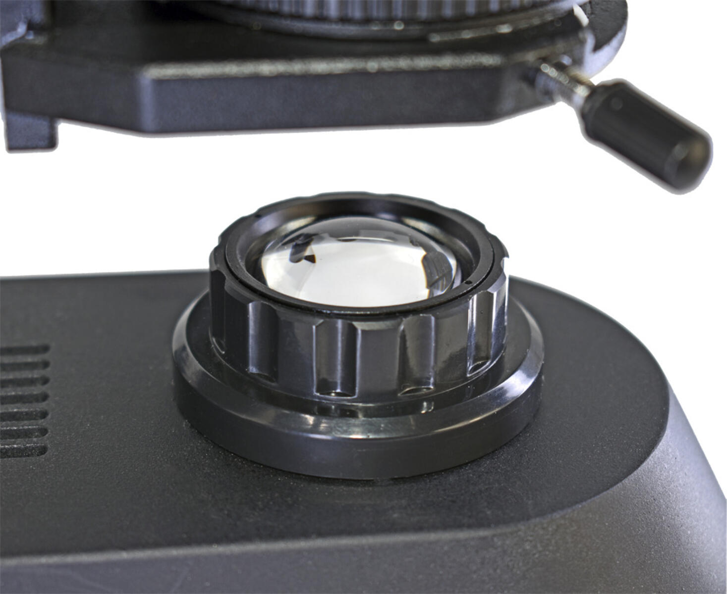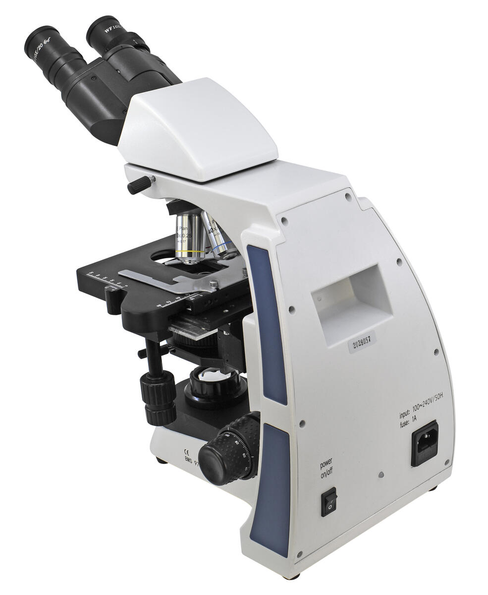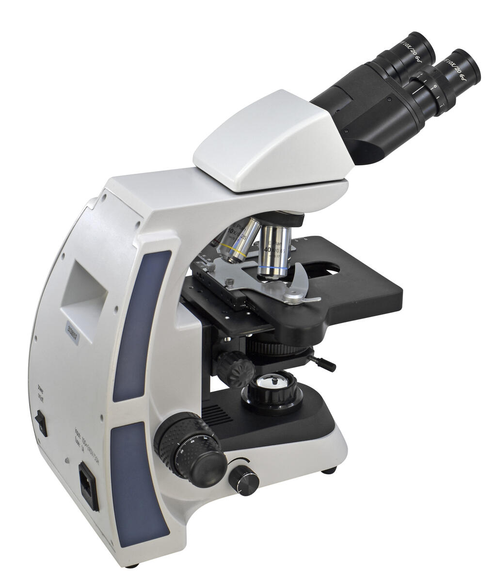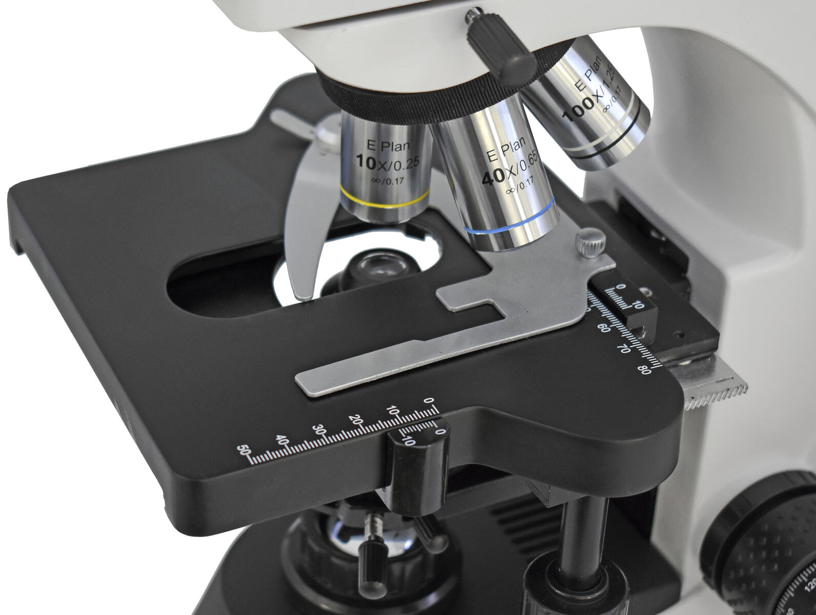 Mikroskop med binokulärt huvud, 4 st högupplösta objektiv och två bredfältsokular (WF) inklusive planoptik som ger färgglada och tydliga bilder med hög kontrast. Den stora arbetsytan, 144 x 200 mm, tillåter två prover samtidigt. Den integrerade X-Y-preparathållaren är enkel att använda tack vare de ergonomiskt placerade koaxialkontrollerna. Abbe-kondensorn är lätt att byta ut mot olika tillbehör som mörkfälts- eller faskontrastkondensorer. Kondensorn kan justeras i höjdled med hjälp av kuggstångssystemet.