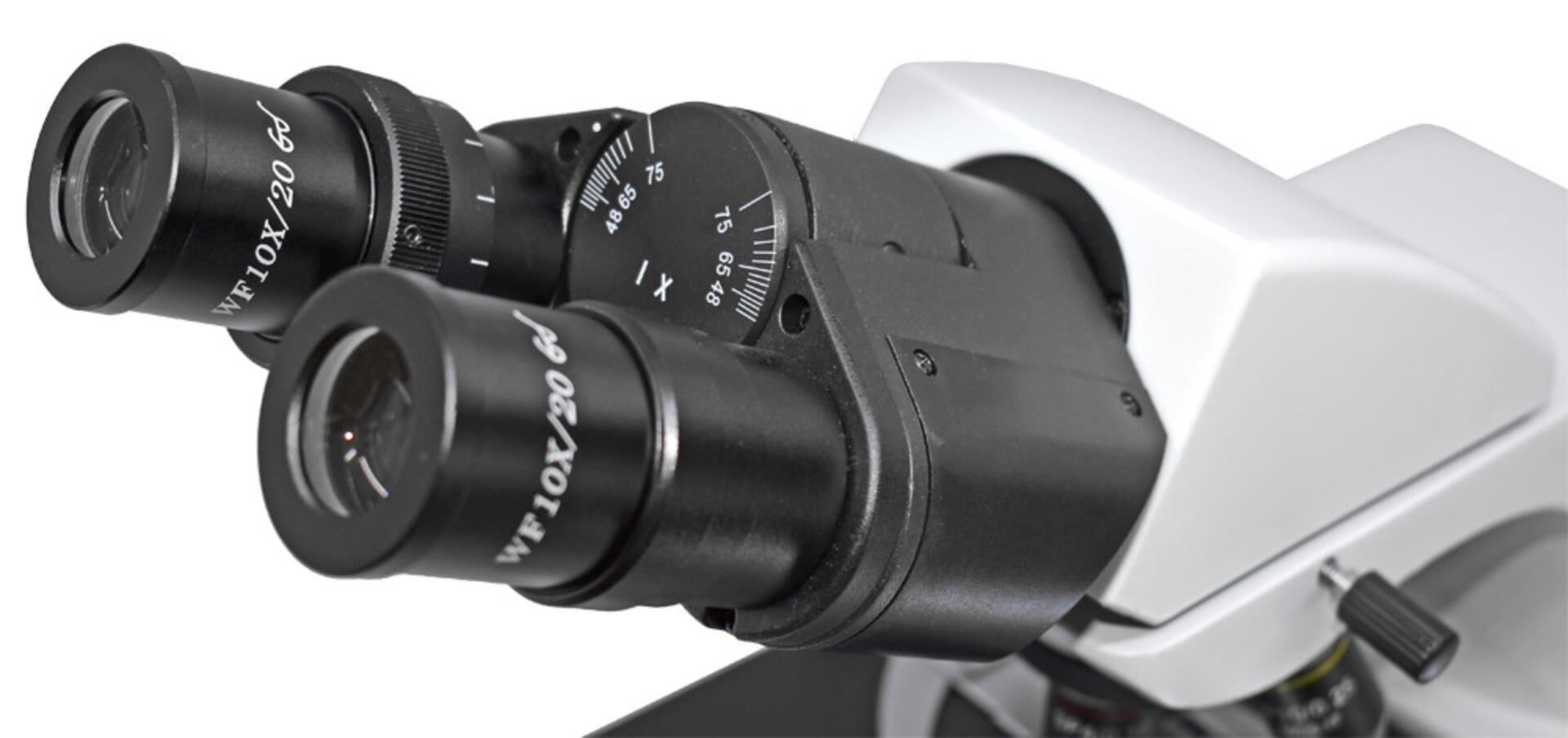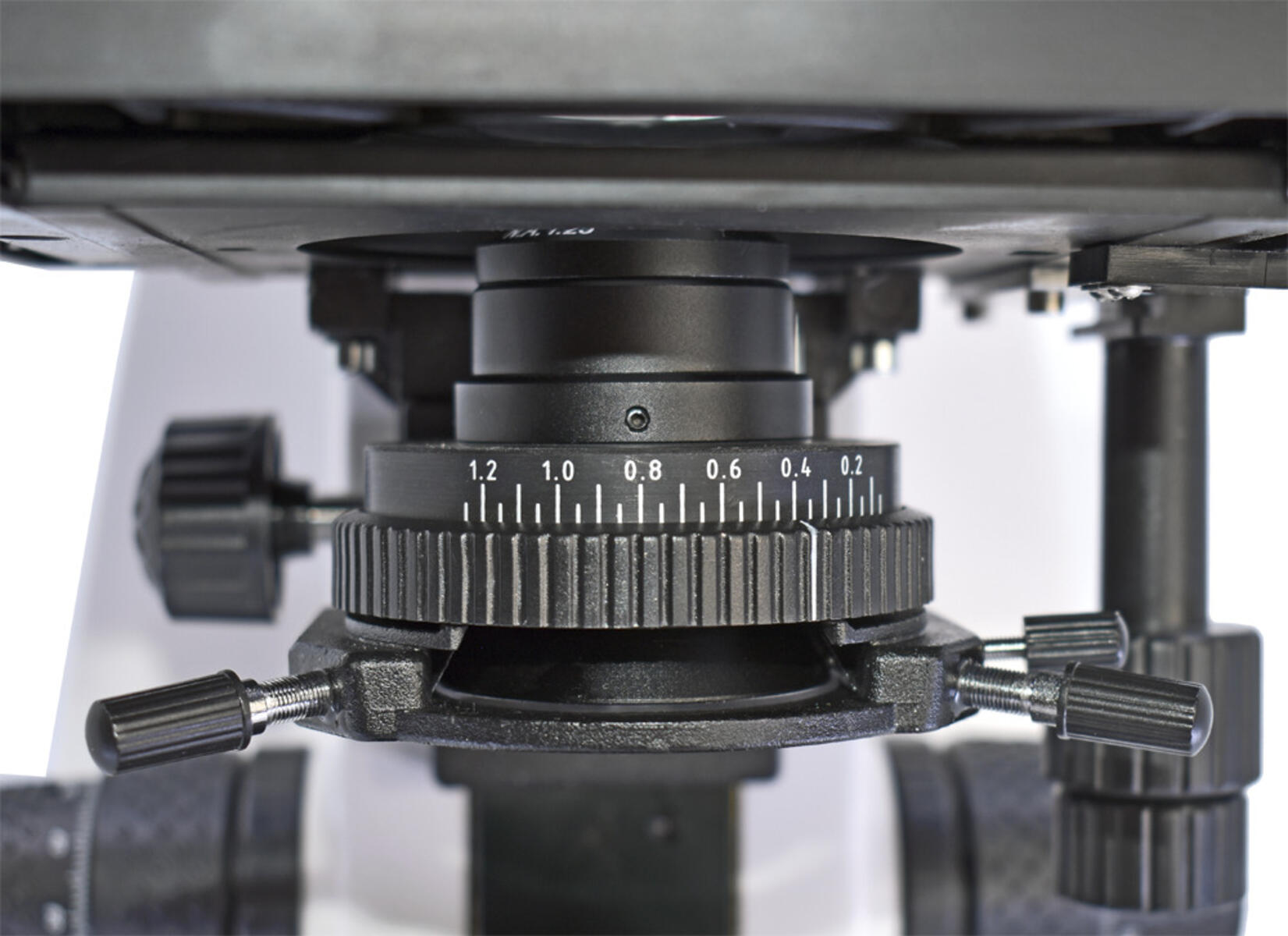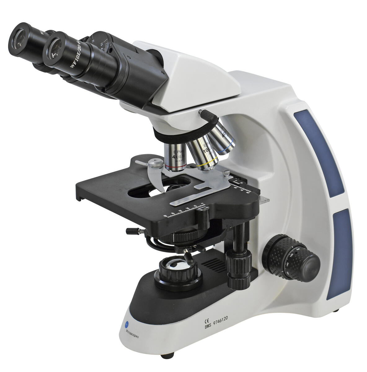 Mikroskop med binokulärt huvud, 4 st högupplösta objektiv och två bredfältsokular (WF) inklusive planoptik som ger färgglada och tydliga bilder med hög kontrast. Den stora arbetsytan, 144 x 200 mm, tillåter två prover samtidigt. Den integrerade X-Y-preparathållaren är enkel att använda tack vare de ergonomiskt placerade koaxialkontrollerna. Abbe-kondensorn är lätt att byta ut mot olika tillbehör som mörkfälts- eller faskontrastkondensorer. Kondensorn kan justeras i höjdled med hjälp av kuggstångssystemet.