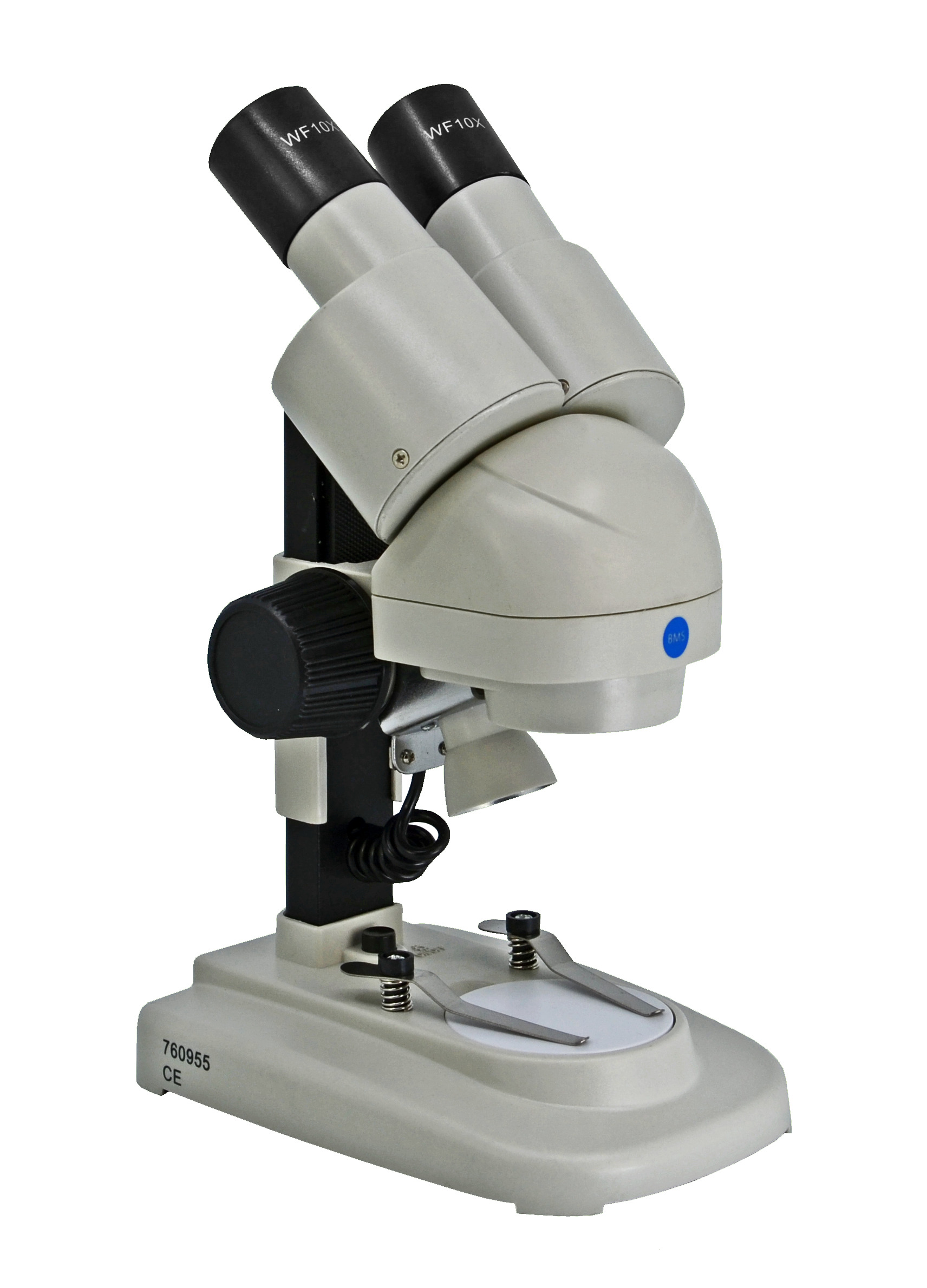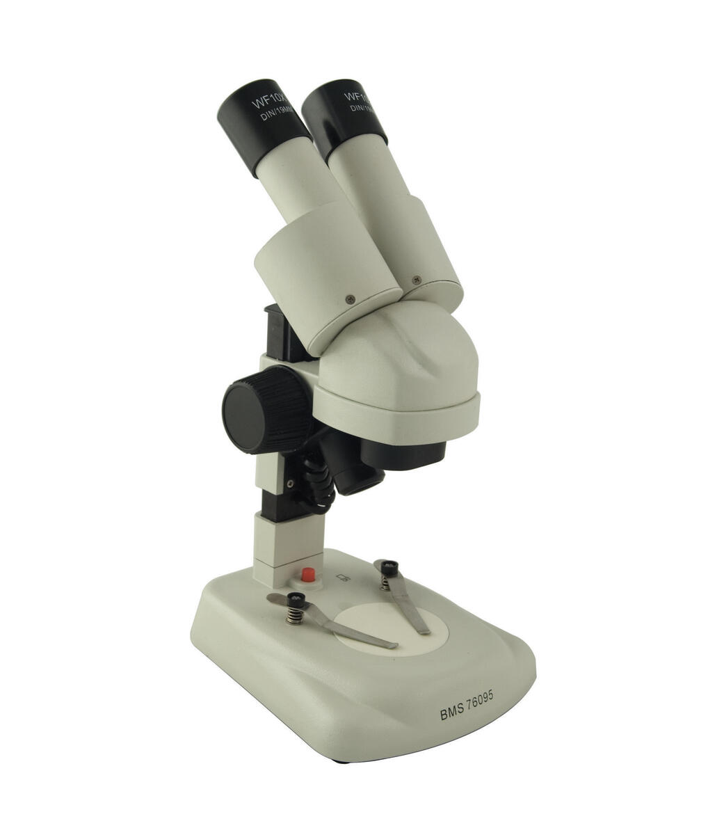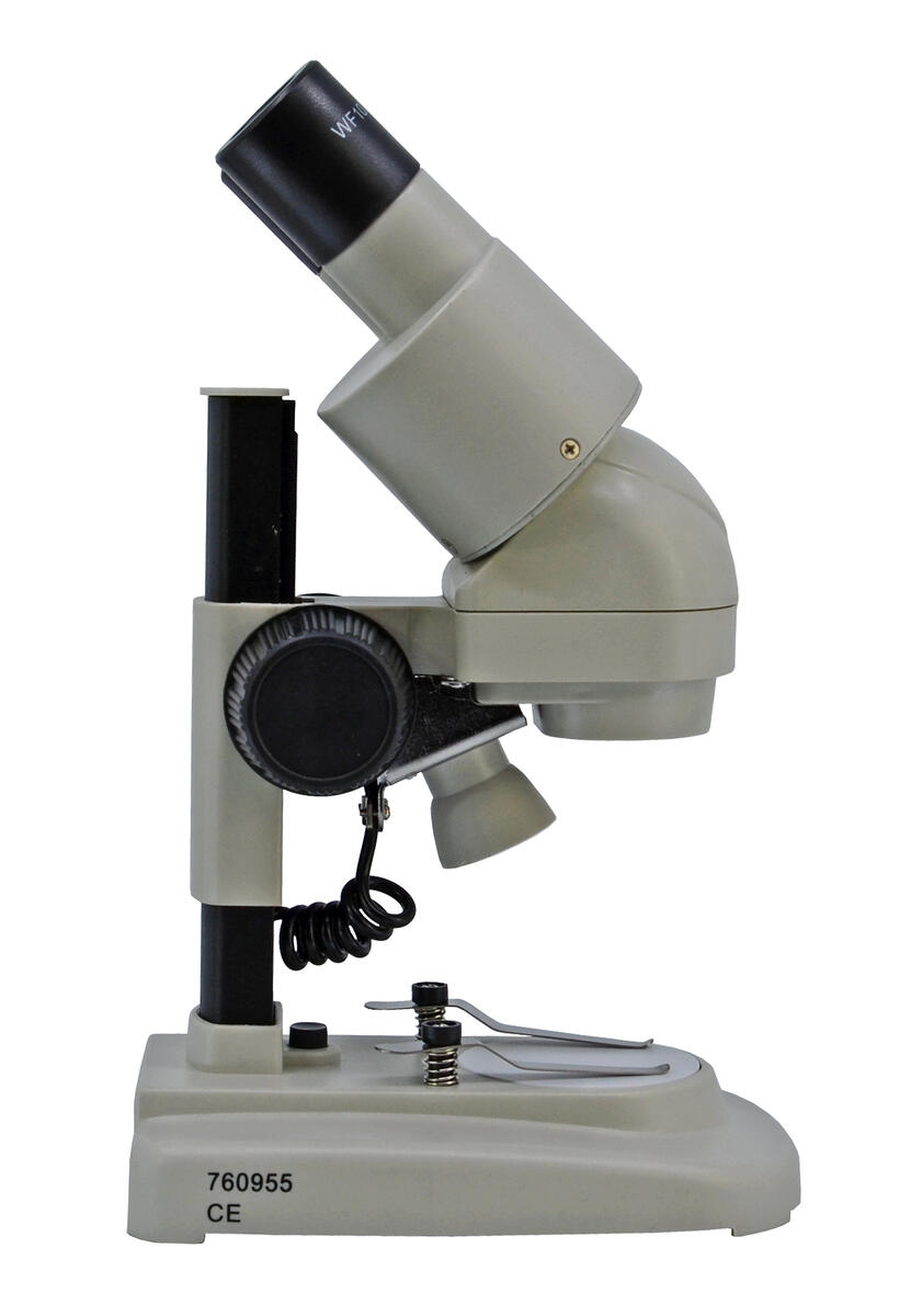 Prisvärt och robust basmikroskop. Förstorar 40-400x. Tre fjädrande objektiv 40x, 100x och 400x. Ratt som ger möjlighet till både fin- och grovjustering. Huvudet kan roteras 360°. Vidvinkelokular 10x. Kondensor med irisbländare. Lampa 20 W. Hög optisk kvalitet.