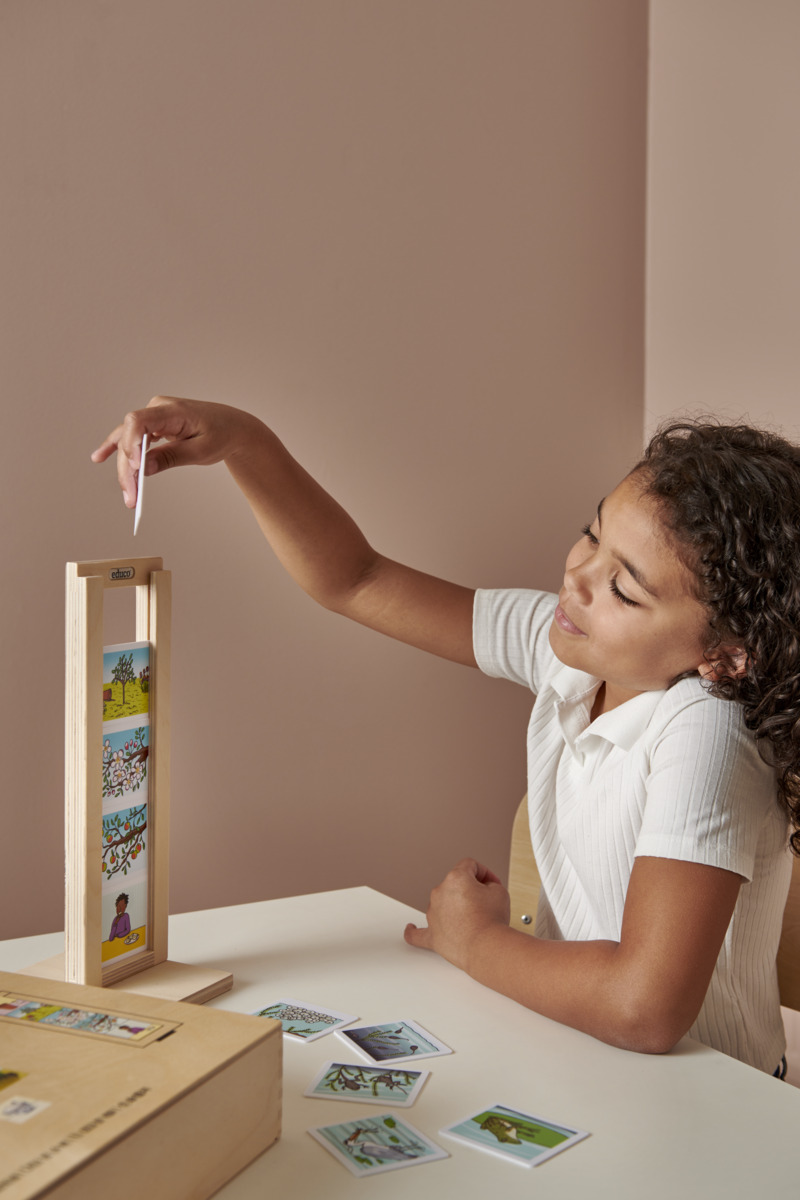 25 plastkort som är självrättande med hjälp av mönster på baksidan. Placera 5 kort i en logisk följd och skapa en berättelse. Utveckla logiskt tänkande och berättarförmåga. Uppmuntra barn att skapa egna berättelser. Trälåda för förvaring och manual på engelska ingår. Mått på korten: 9x9 cm, mått trälåda: 24x12,5x7 cm. Från 3 år.