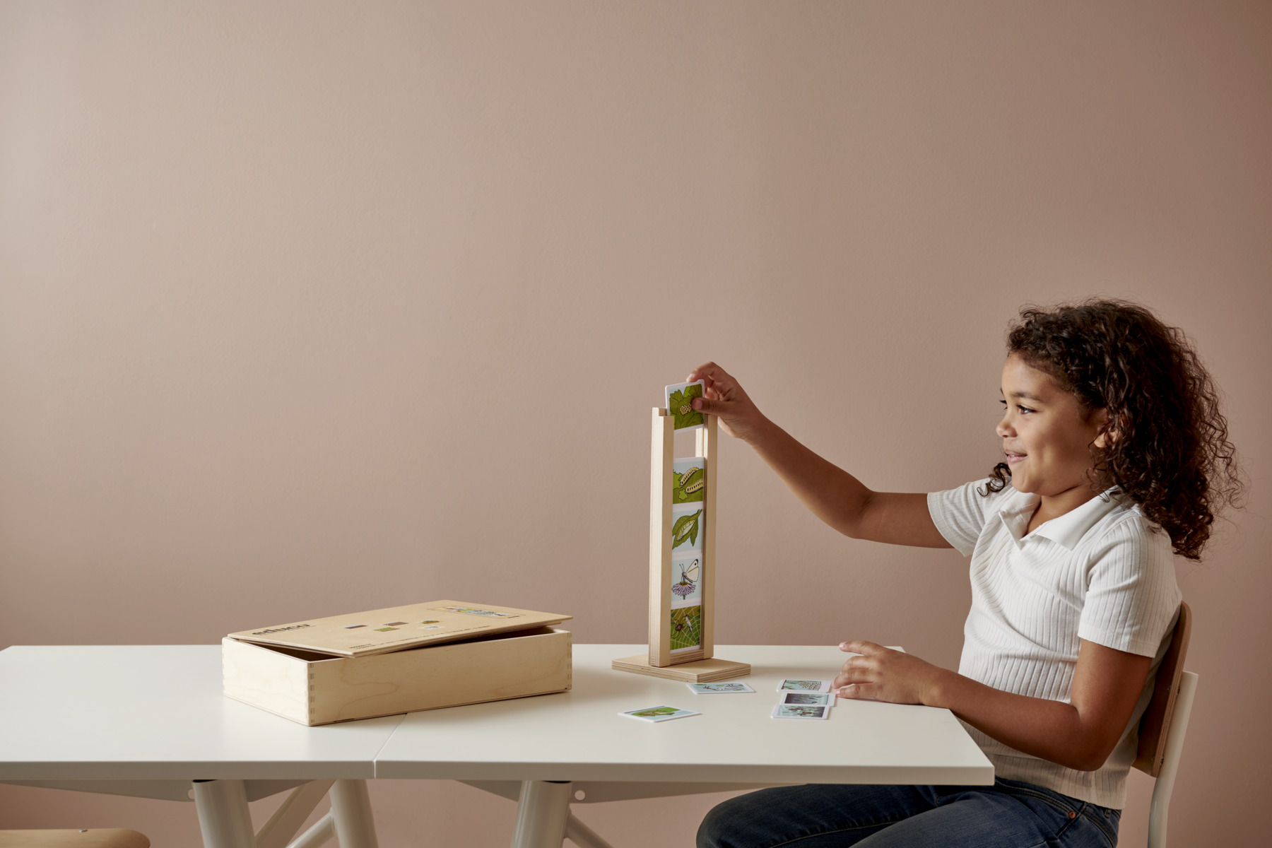 2 träställningar, 50 bildkort i plast, trälåda för förvaring. Materialet innehåller livscyklerna för människa, hund, geting, fjäril, groda, fågel, blomma, morot, äpple och ris. Stärker ordförråd och uppmuntrar till samtal om natur och livscykler. Självkontroll med bilder på baksidan av korten. Manual på engelska ingår. Mått: träställning 10x14,5x33 cm, bildkort 7x6 cm, trälåda 33,5x22,5x7 cm. Från 5 år.