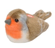 Verklighetstrogen fågel i plysch. När man trycker på den härmar den rödhakens läte. Storlek 13-16 cm.