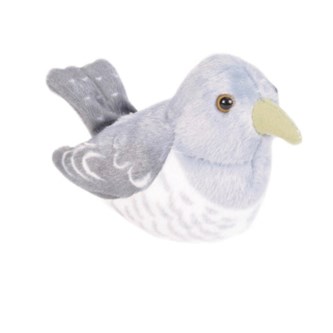 Verklighetstrogen fågel i plysch. När man trycker på den härmar den gråsparvens läte. Storlek 13-16 cm.