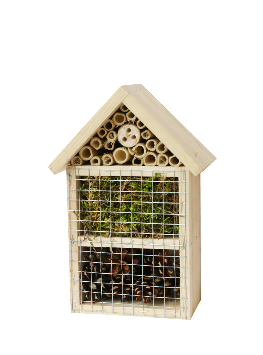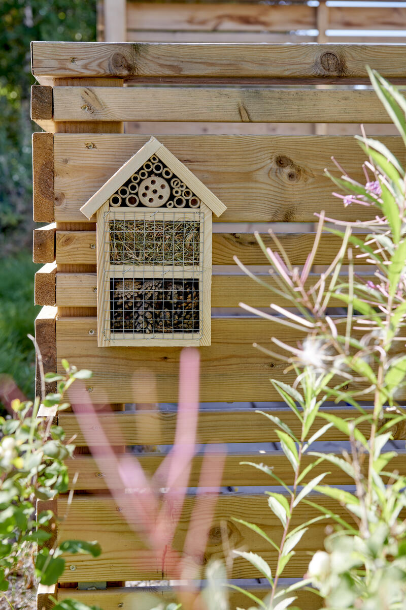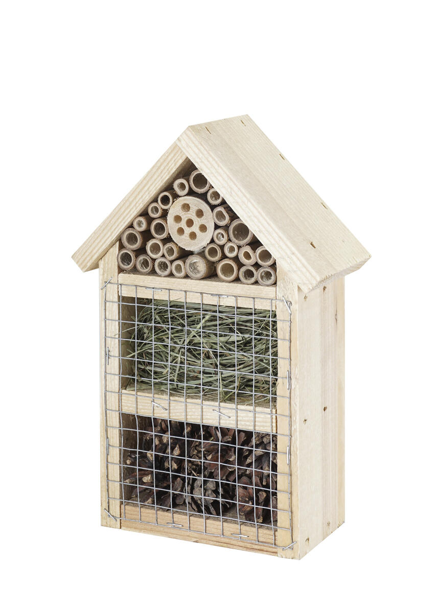 Med ett insektshotell kan du ge nyttiga insekter skydd och övervintringsmöjlighet och på så sätt bidra till att öka den biologiska mångfalden. I detta insektshotell finns plats för nyttoinsekter som bin, fjärilar och nyckelpigor.