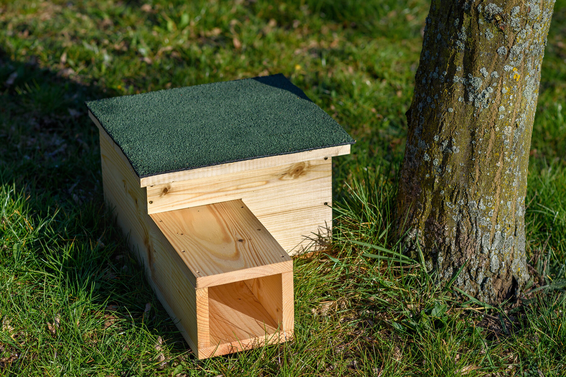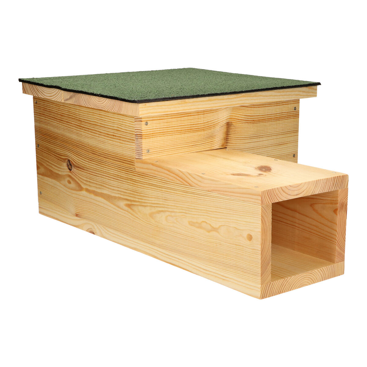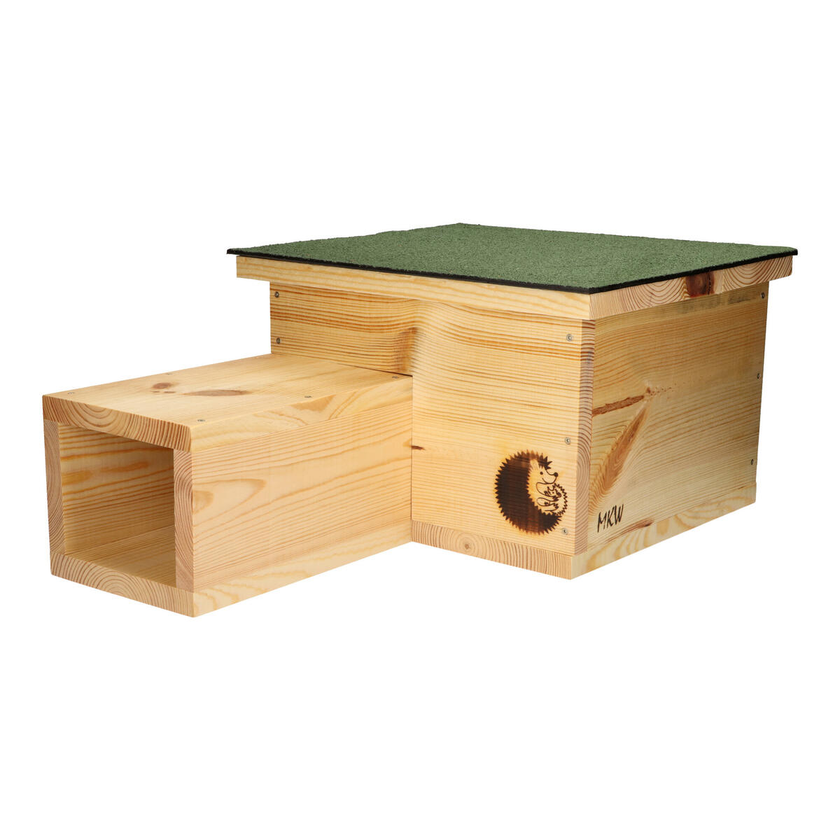Detta igelkottshus håller hög kvalitet och är tillverkat av slitstarkt, massivt FSC-certifierat trä som är behandlat med 2 lager luktfri linolja. Huset har ett öppningsbart tak som är beklätt med skyddande tjärpapp. Ingången är en lång korridor som skyddar igelkottar mot rovdjur och ger optimala förhållanden i huset. Trägolvet isolerar från den kalla, våta marken och huset har både dränering- och ventilationshål. Placera huset på en lugn, undangömd, om möjligt skuggad plats under buskar eller i en häck i trädgården. Levereras färdigmonterat med rostfria skruvar. Mått: 32x32 cm, exklusive ingångskorridor som är 26 cm lång.