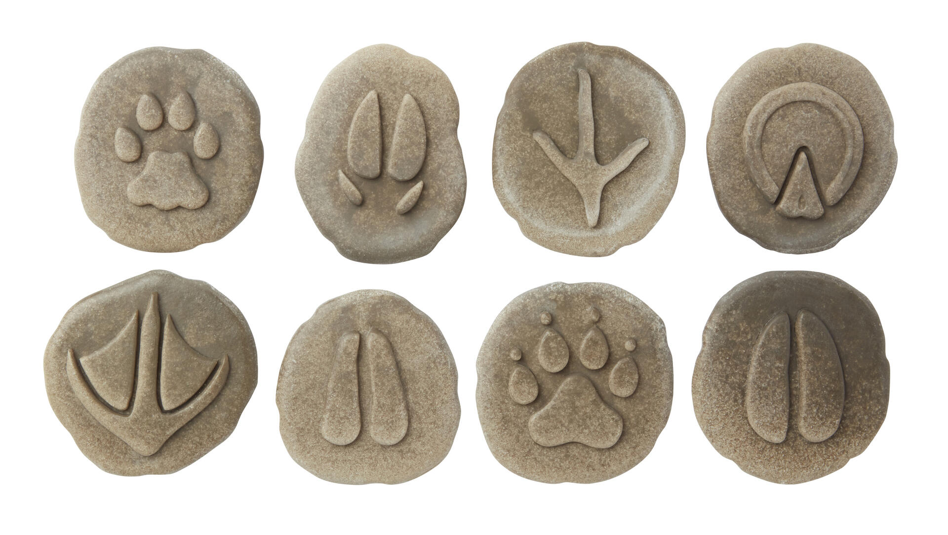 En fascinerande och realistisk uppsättning med 8 fotavtryck: räv, ekorre, kanin, groda, rådjur, vråk, uggla och mus. Stenarna kan användas till sortering efter kategorier, livsmiljö, föda etc., eller till att göra avtryck i t.ex. lera. Tillverkade av en slitstark stenblandning för utomhusbruk. Stenarna är dubbelsidiga. PVC-fri. Från 3 år.