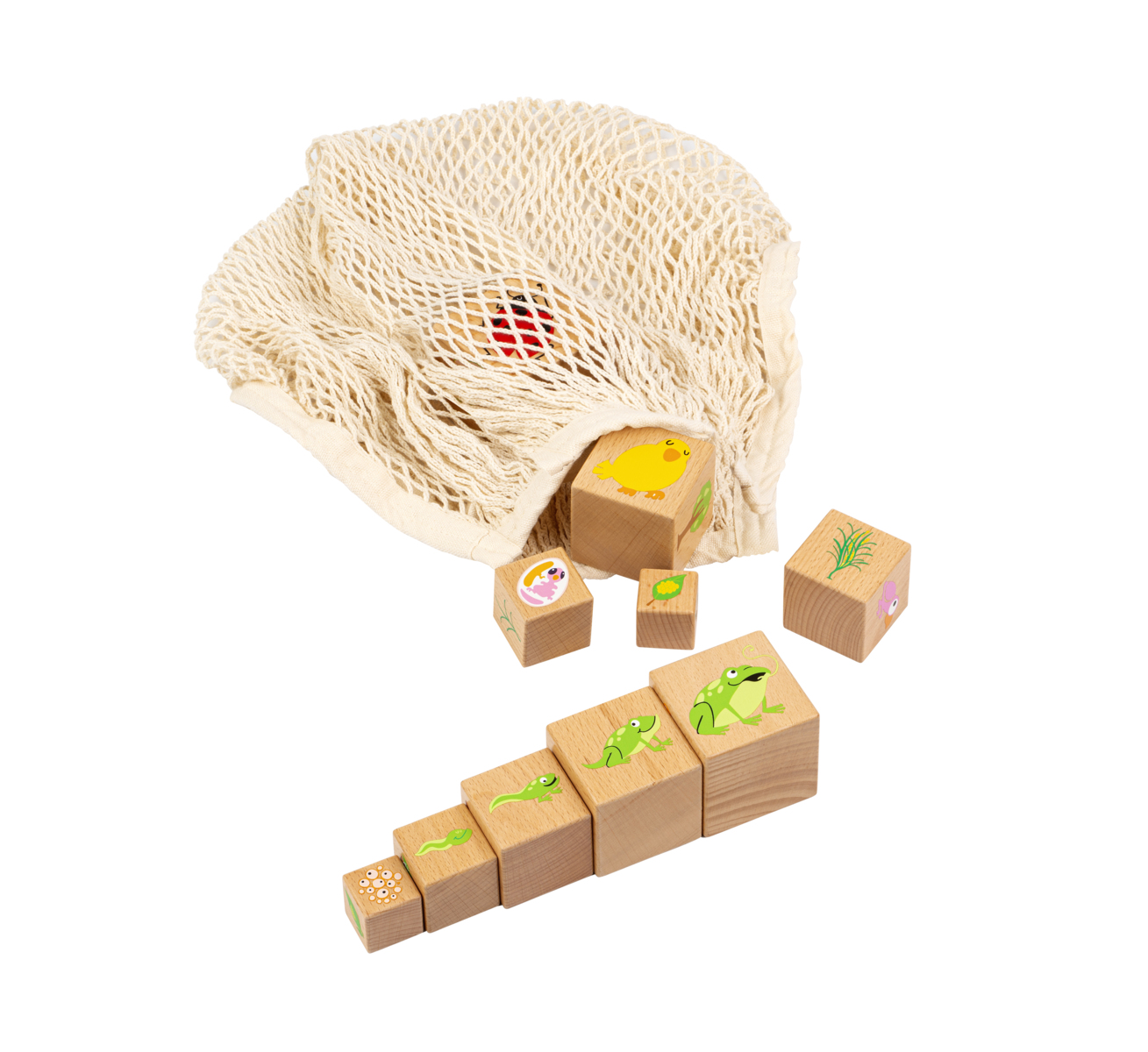 10 träklossar med bilder på. Setet innehåller livscykeln i 5 steg för människa, fjäril, groda, blomma, ris, fågel, päron och nyckelpiga samt en bomullspåse för förvaring. Med detta material får barnen lära känna utvecklingen av växter och djur. Detta stimulerar ordförrådet och uppmuntrar samtal om natur och livscykler. Manual på engelska ingår. Mått största klossen: 5,5x5,5 cm, minsta klossen: 2,5x2,5 cm. Från 4 år.