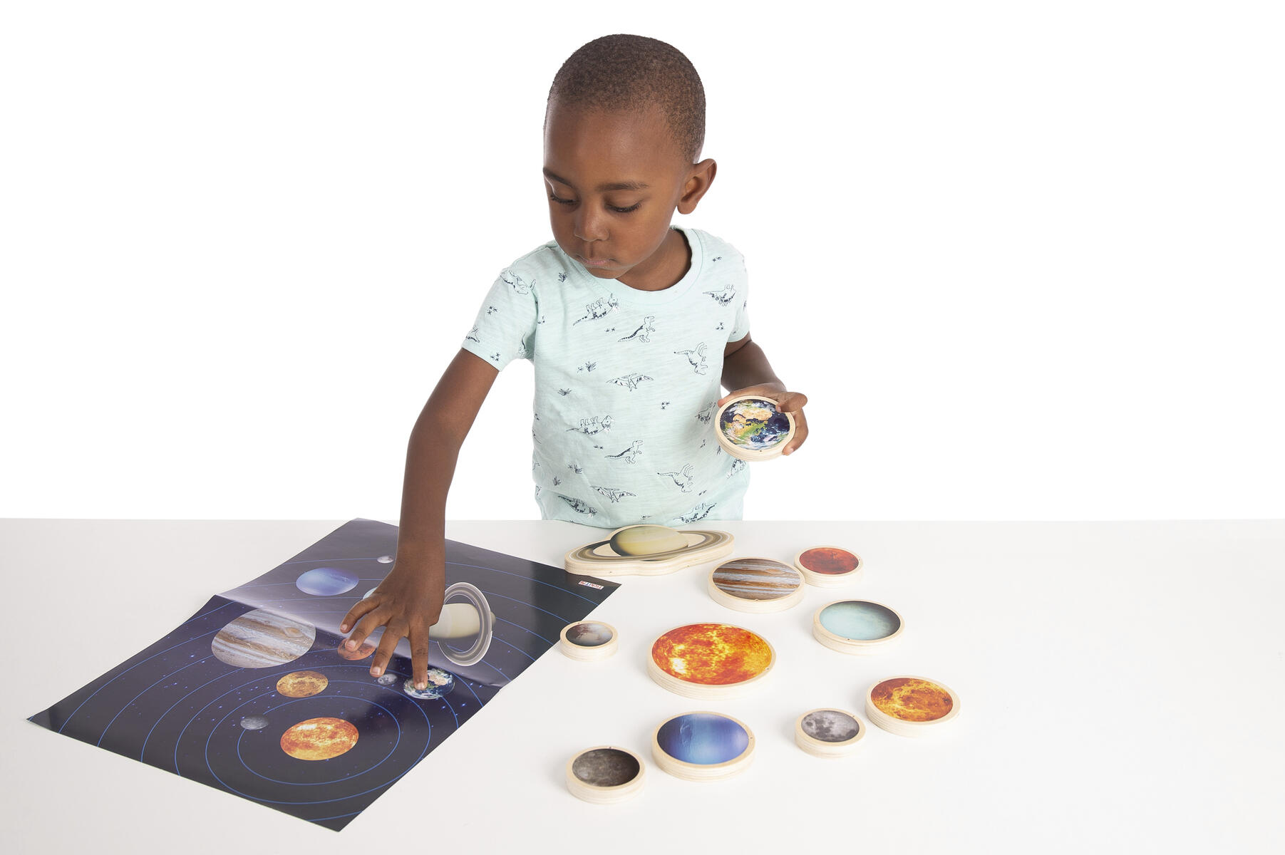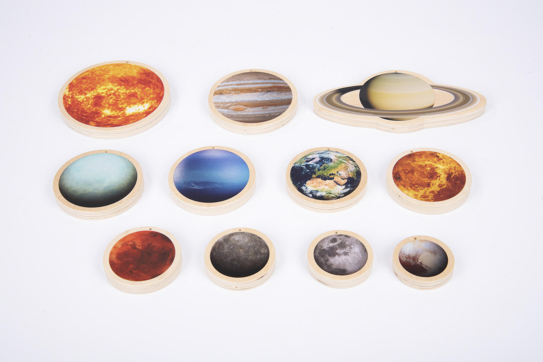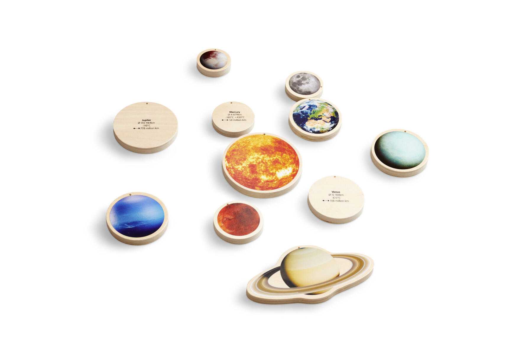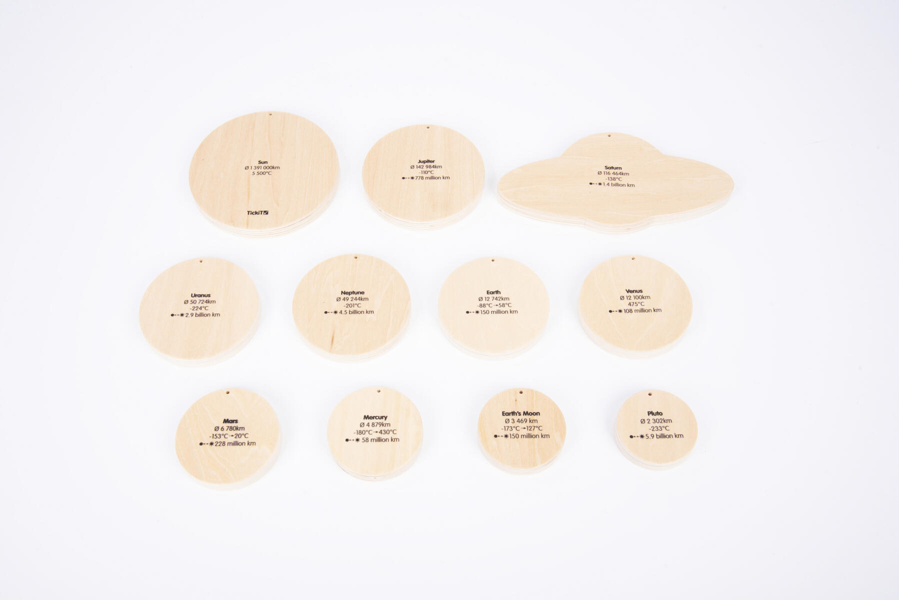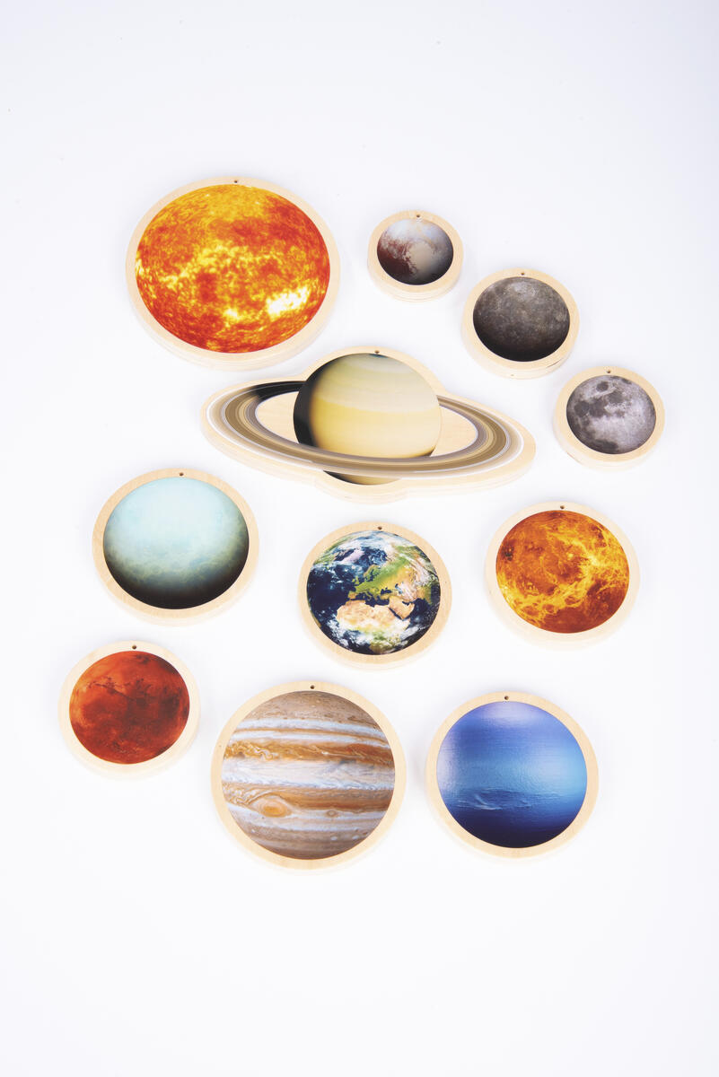 Släta och taktila plywoodskivor, färgtryckta på ena sidan med vackra tydliga fotorealistiska illustrationer av solen, månen och planeterna. På baksidan står namn, diameter, medeltemperatur och avstånd från solen. De tjocka skivorna är lätta för barn att hantera. Med upphängningshål. En informativ färgtryckt guide och en affisch i A3-format medföljer. Av FSC-märkt trä. PVC-fri. Från 1 år.