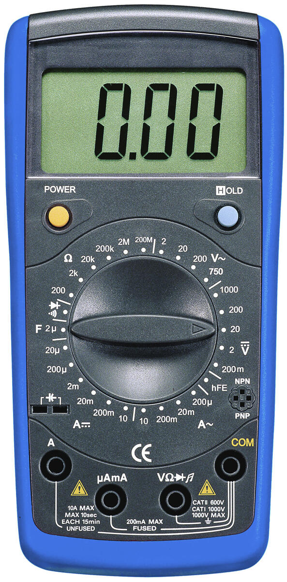 Digital multimeter, även med analog visning av mätvärde. Mätfunktioner: Spänning, ström, resistans och diod-test. Automatisk ljudsignal vid felaktig anslutning, begränsar risken för skador. Manuellt eller automatiskt intervallval, indikering av polaritet, samt indikering av överskridet mätintervall. Automatisk avstängning. Levereras komplett med mätkablar, manual, stötskyddande skal och batteri. Display: 3 1/2 siffra LCD. Mätområde 0–600 V, 0–10 A, 0,1 Ω – 2 MΩ. Mått: 147x70x39 mm. Vikt: 390 g.