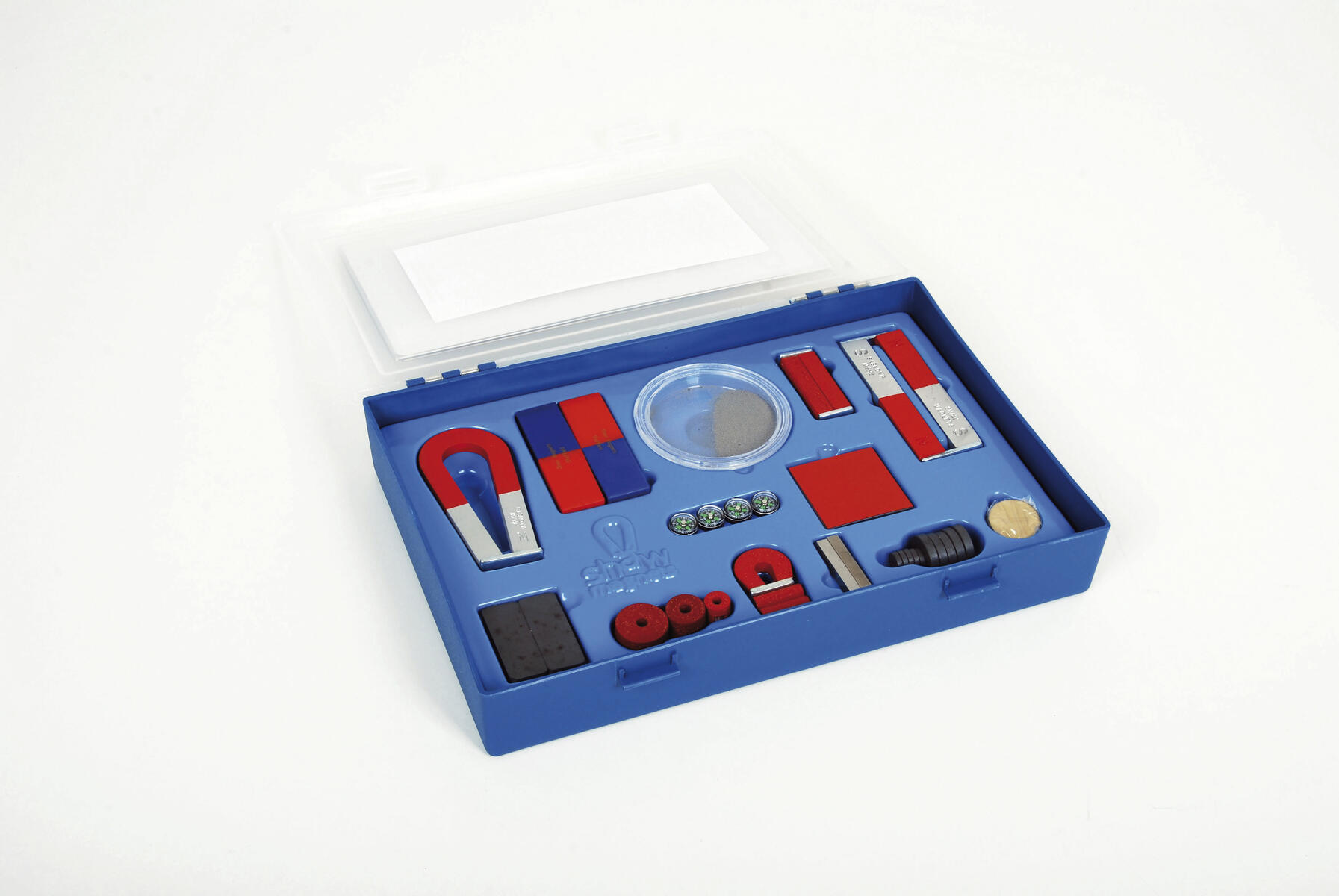 Ett stort set med magneter och material för arbete med magnetism. Innehåller: hästskomagnet krom/stål, 2 stavmagneter med plastöverdrag, 2 ferritblock, 2 Alcomax stavmageneter, plastbubbla med järnfilspån, 4 färgade magnetplattor, 10 ferritringar, Alnico cylindermagneter i olika strolekar, 4 plottringskompasser, gjuten Alnico hästskomagnet, 2 Alnico rundstavar, 8 metallskivor stämplade med metalltyp, 2 Alnico stavmagneter, 2 magneter av krom/stål.