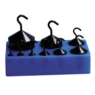 9 st krokvikter av lackerat stål. I vikternas botten finns en skåra där det sitter en stav, som gör att vikterna kan hängas i varandra. Varje vikt är graderad, 10 g, 2 st 20 g, 50 g, 100 g, 2 st 200 g, 500 g, 1000 g. Levereras i plastblock för smart förvaring.