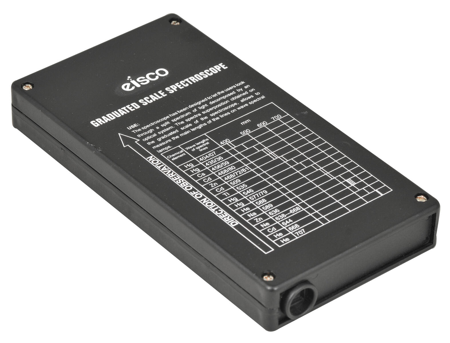 Direktseende elevspektroskop för undervisning i fysik. Försett med ett högeffektivt galler i okularet som ger ett lysande spektrum även i dåligt ljus. Den justerbara slitsen ger maximal upplösning och de skarpaste banden vid dominerande våglängder, sett direkt mot en skala graderad i nanometer.