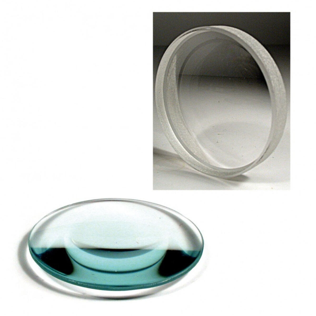Av glas. Pluslins. Konvex på båda sidor. Brännvidden är 10 cm.