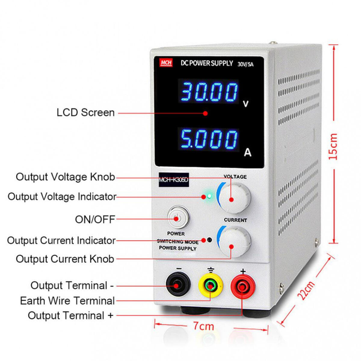 Modernt spänningsaggregat i kompakt design. Likspänning 0-30 V. Stabiliserad. Rippel < 50 mV. Display, 4 siffror voltmeter med 0,1 V noggrannhet. Amperemeter med 0,01 A noggrannhet. Anslutningar plus, minus och jord. Säkring 1,6 A. Mått: L = 210 mm, B = 70 mm, H = 150 mm.