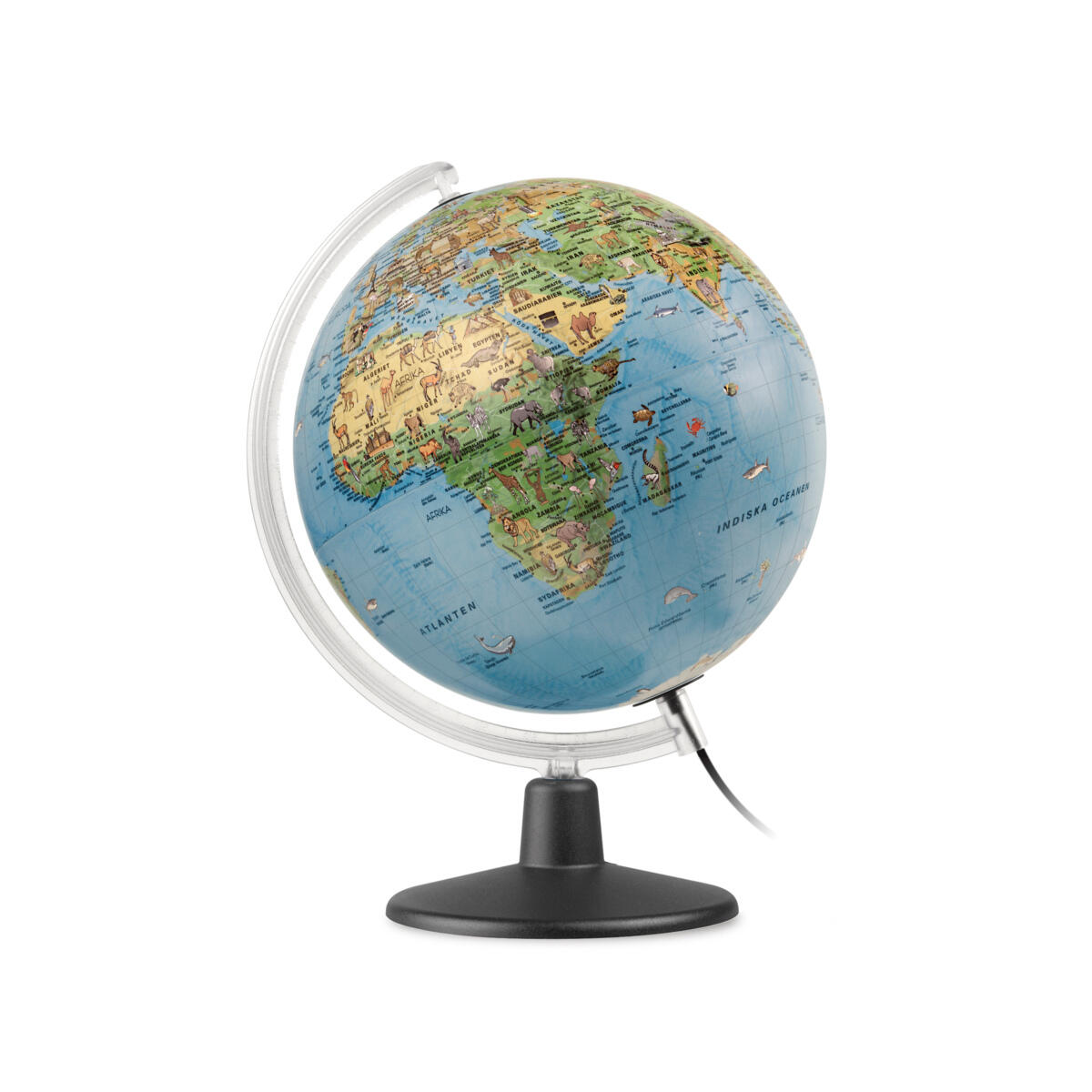 En jordglob med djur och kända landmärken samt belysning. Fot i svart plast och meridian i frostad plast. Svensk text. Mått: 30 cm. Av ABS, PS och PVC, fri från ftalater.
