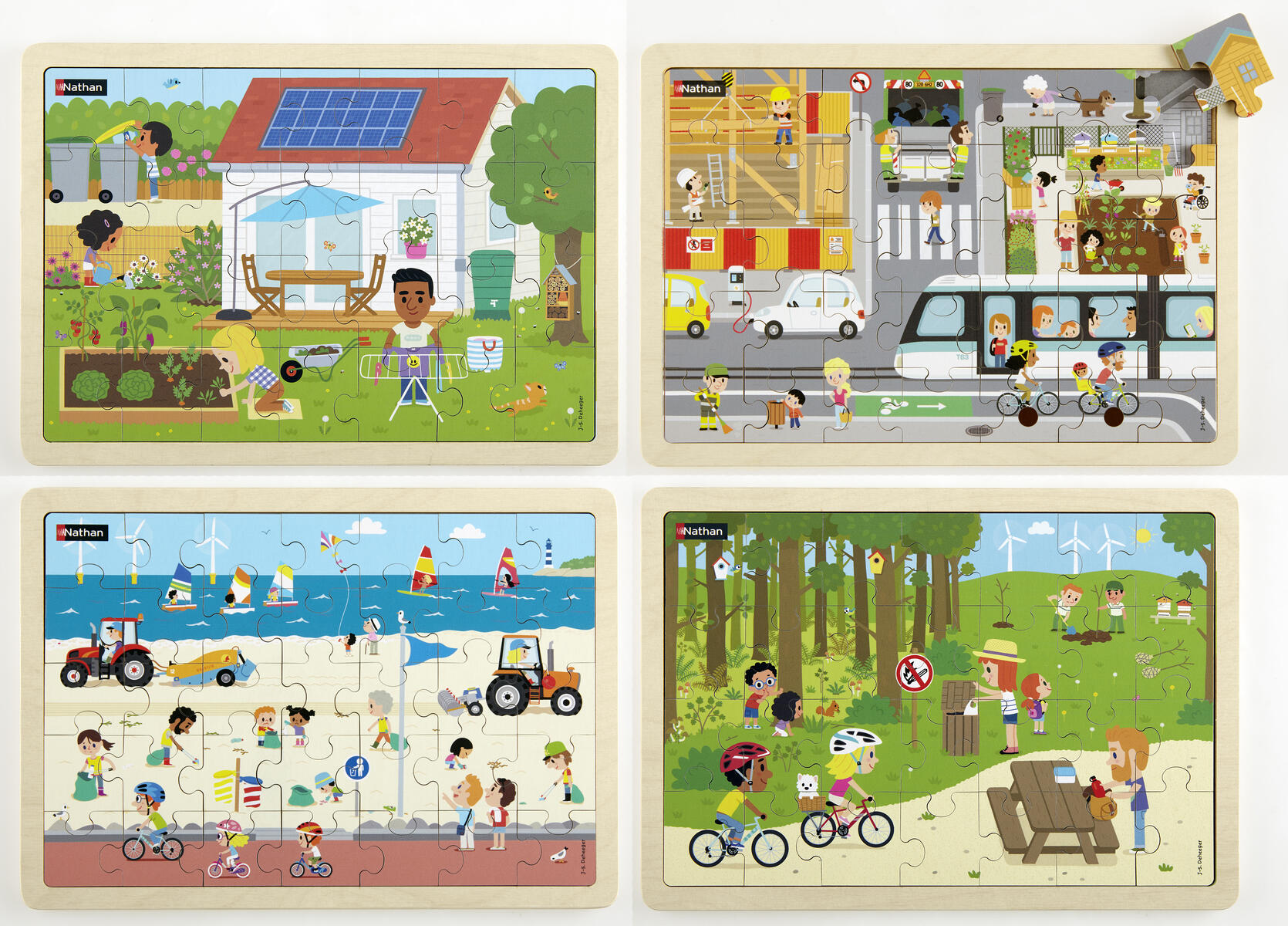 4 st. Fina pussel som visar hur vi kan ta hand om miljön. De visar miljöer från trädgården, staden, havet och skogen. Under pusslet finns ett plastunderlägg med motivet tryckt på, som man kan lägga efter om det känns för svårt. Med 28 eller 35 pusselbitar. Mått: 30x21 cm. PVC-fri. Från 3 år.