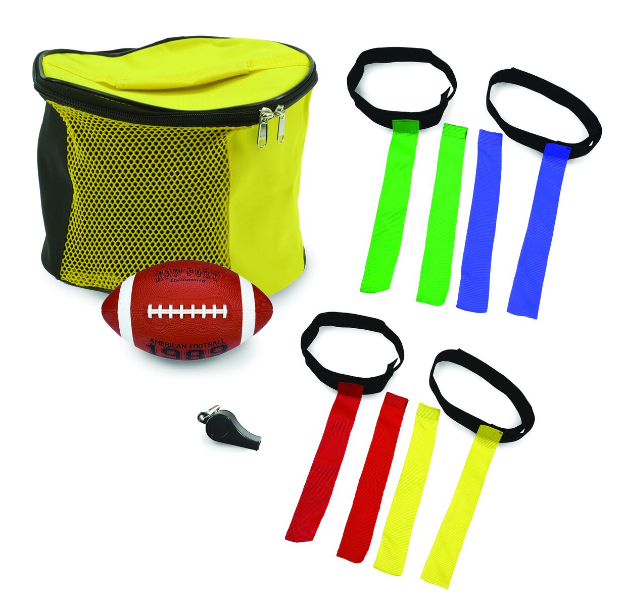 Ett komplett set för flaggfotboll innehållande en amerikansk fotboll, visselpipa, förvaring och ett stort flaggfotbollsset med 4 färger. Träna reflexer, snabbhet, kondition och balans samtidigt som du har roligt. Placera bältet på varierande ställen på kroppen, beroende på svårighetsgrad. Flaggorna sitter fast med stark kardborre. Barnen kan t.ex. leka tafatt genom att samla flaggor. Innehåller 20 bälten och 40 flaggor i 4 olika färger. Bältets längd är 97 cm. Flaggornas längd är 37 cm. Av polyester.