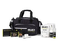 Slitstark sjukvårdsväska med flyttbara fack samt plats för vattenflaska. Innehåll: fyra ispåsar, tejp, plåster, sax, kompressionslinda, rengöring, liniment, absorberande pads.