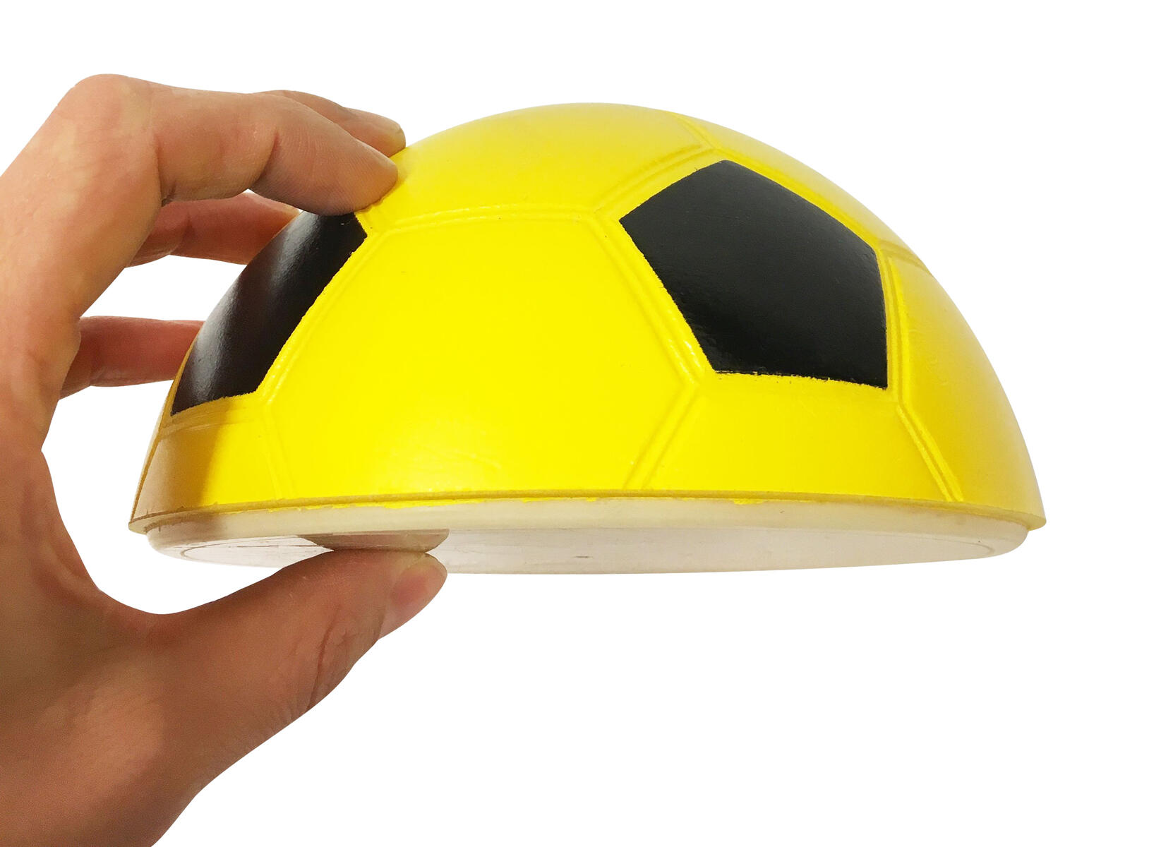 En halv fotboll för användning inomhus. Bollen rör sig långsammare än en vanlig boll då den glider fram över golvet. Mått: 7,5x15 cm. Av ABS och PU. Från 3 år.