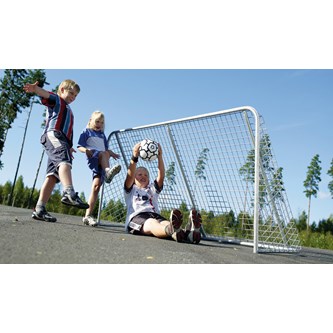 Hoppfällbart mål. Målet har ø 38 mm rörram i aluminium, finmaskigt nät och solid vikmekanism i stål. Kan enkelt vikas och flyttas av så väl barn som vuxen. Levereras monterat, ska bara fällas ut. Mått: 120 x 80 x 60 cm. Vikt: 9,2 kg. (Boll ingår ej.)