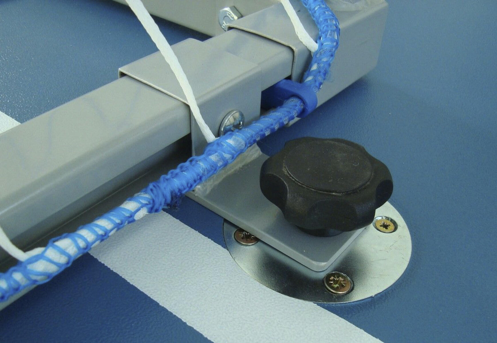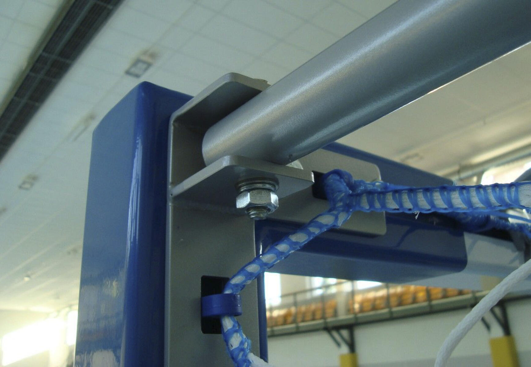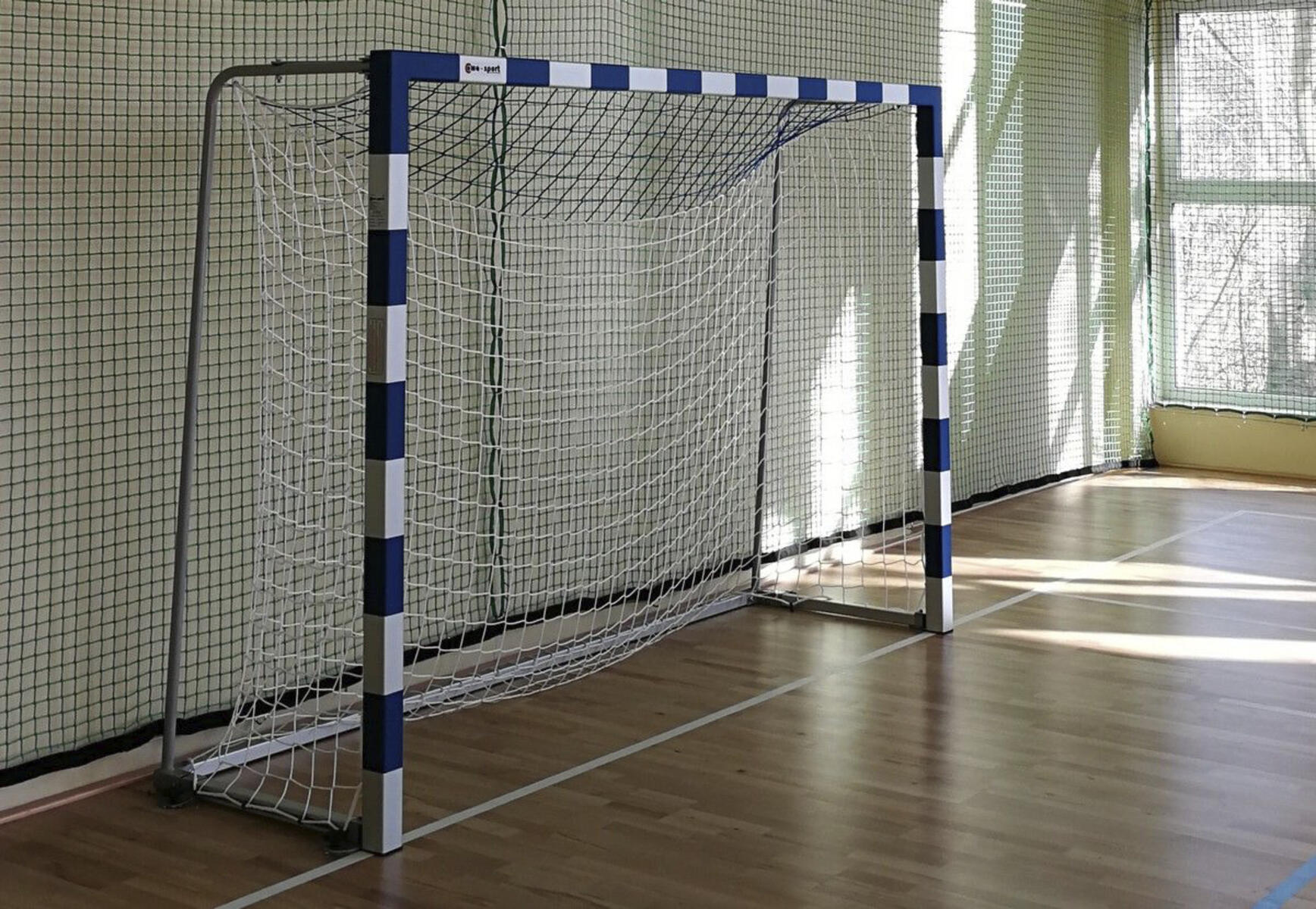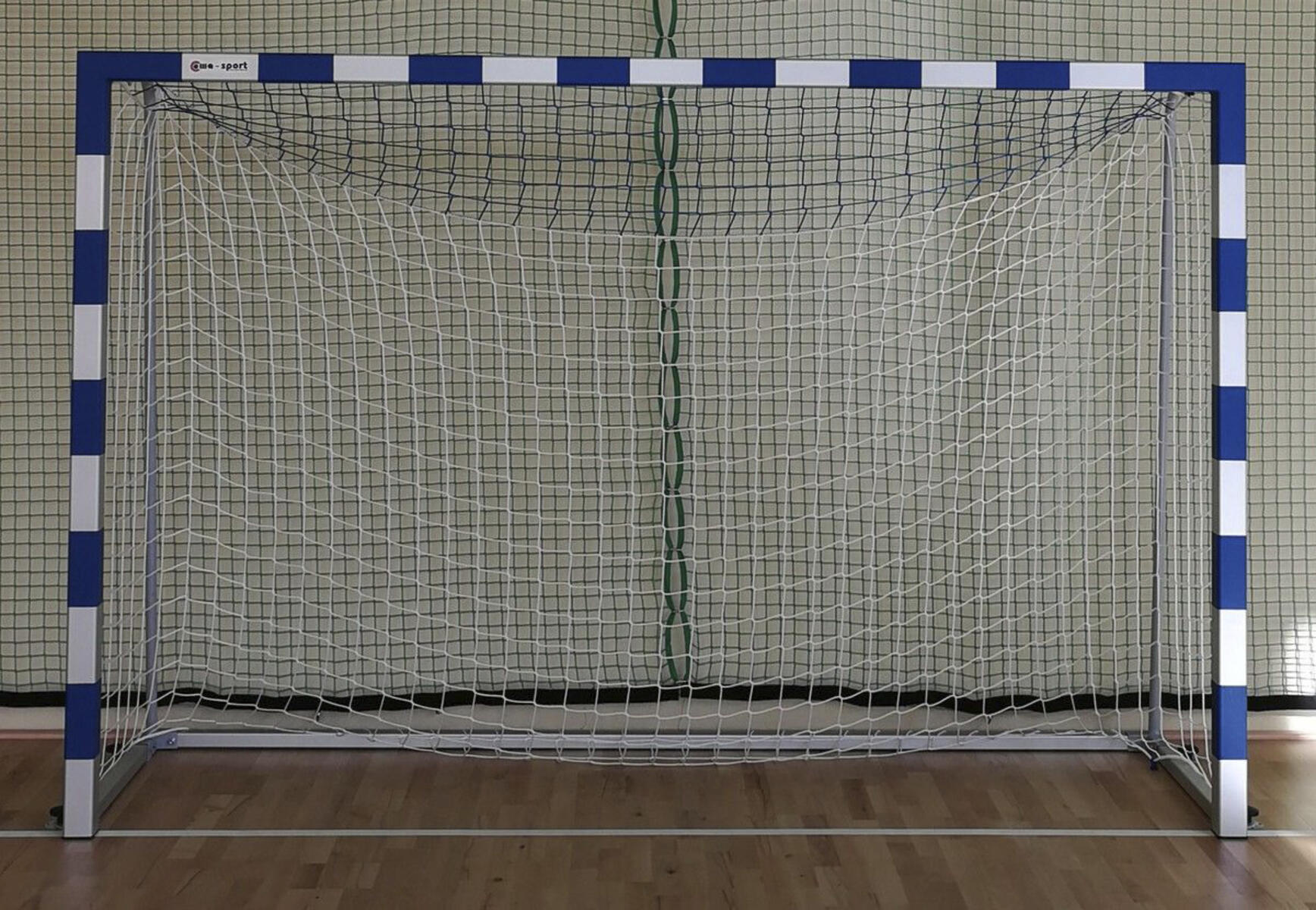 Godkänt tävlingsmål enligt EN749. Målet är av aluminium och är väldigt stabilt tack vare sina svetsade hörn. Målet fästs i golvet med hjälp av golvplattor och säkerhetsskruvar (4-punkts golvfäste) som medföljer målet. Mått: 3x2 m. Nätdjup 80/100 cm. Nät ingår ej.