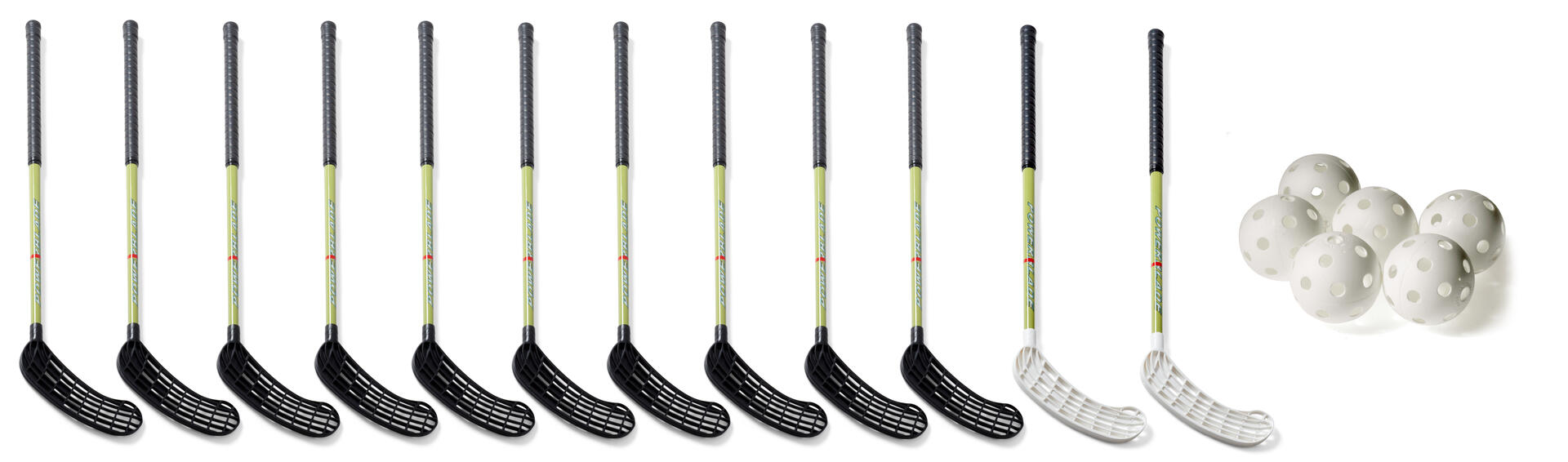Innebandyset med kvalitetsklubbor från Unihoc. Setet innehåller 7 vänsterklubbor och 3 högerklubbor samt 6 IFF-godkända bollar. Skaftlängd: 98 cm. Flex 30.