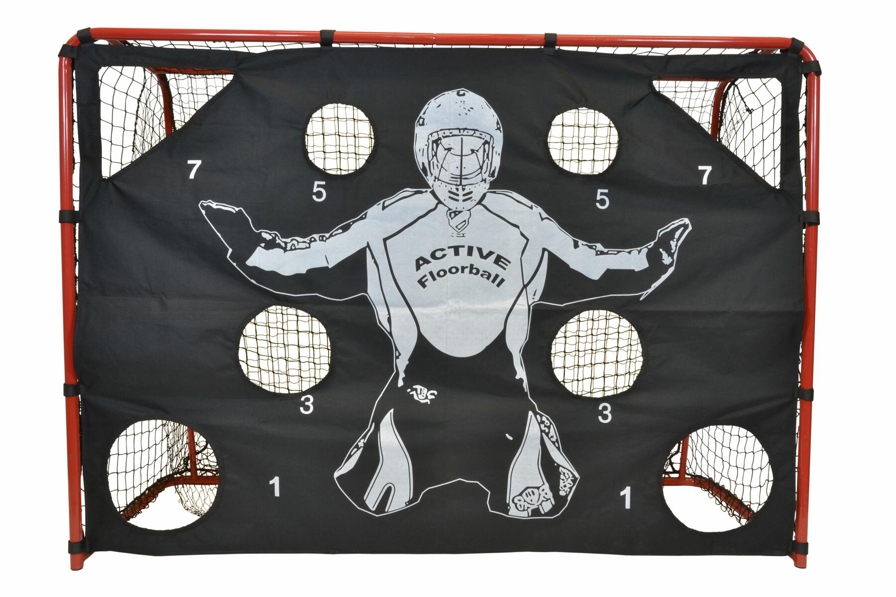 Reglementsenligt helsvetsat IFF-godkänt innebandymål, vilket gör det väldigt stabilt. Tillverkat av lackerade stålrör. Invändiga mått: 160x115 cm. Djup: 40/65 cm. Nät samt droppnät ingår. Vikt: 12,5kg.
