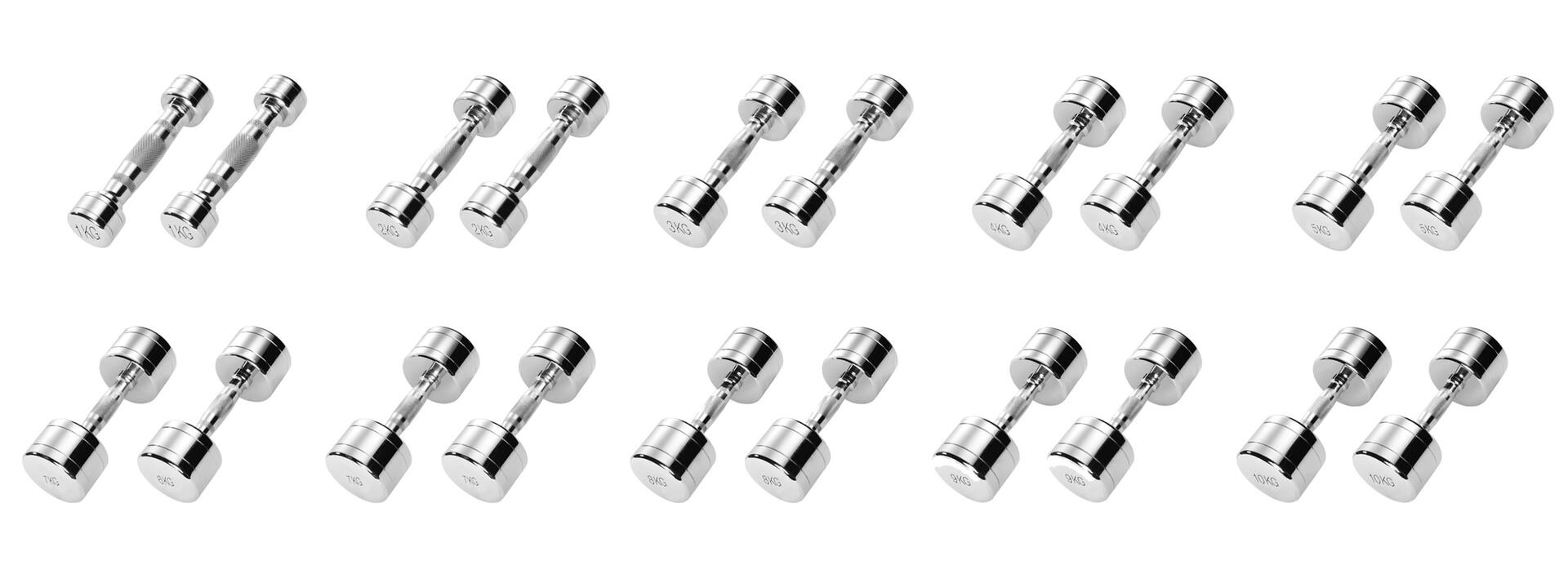 10 st/fp. Klassiska hantlar har blivit mer och mer populära, tack vare att de är både prisvärda samt mycket användbara. Hantlarna har kromade grepp som har en enkel lettring för att ge användaren ett bra grepp under träningen. Ändarna är gummiklädda vilket skonar underlaget samt den sexkantiga formen gör att hantlarna ligger still och även kan användas som grepp när man exempelvis ska göra traditionella armhävningar. Vikterna 1-10 kg.