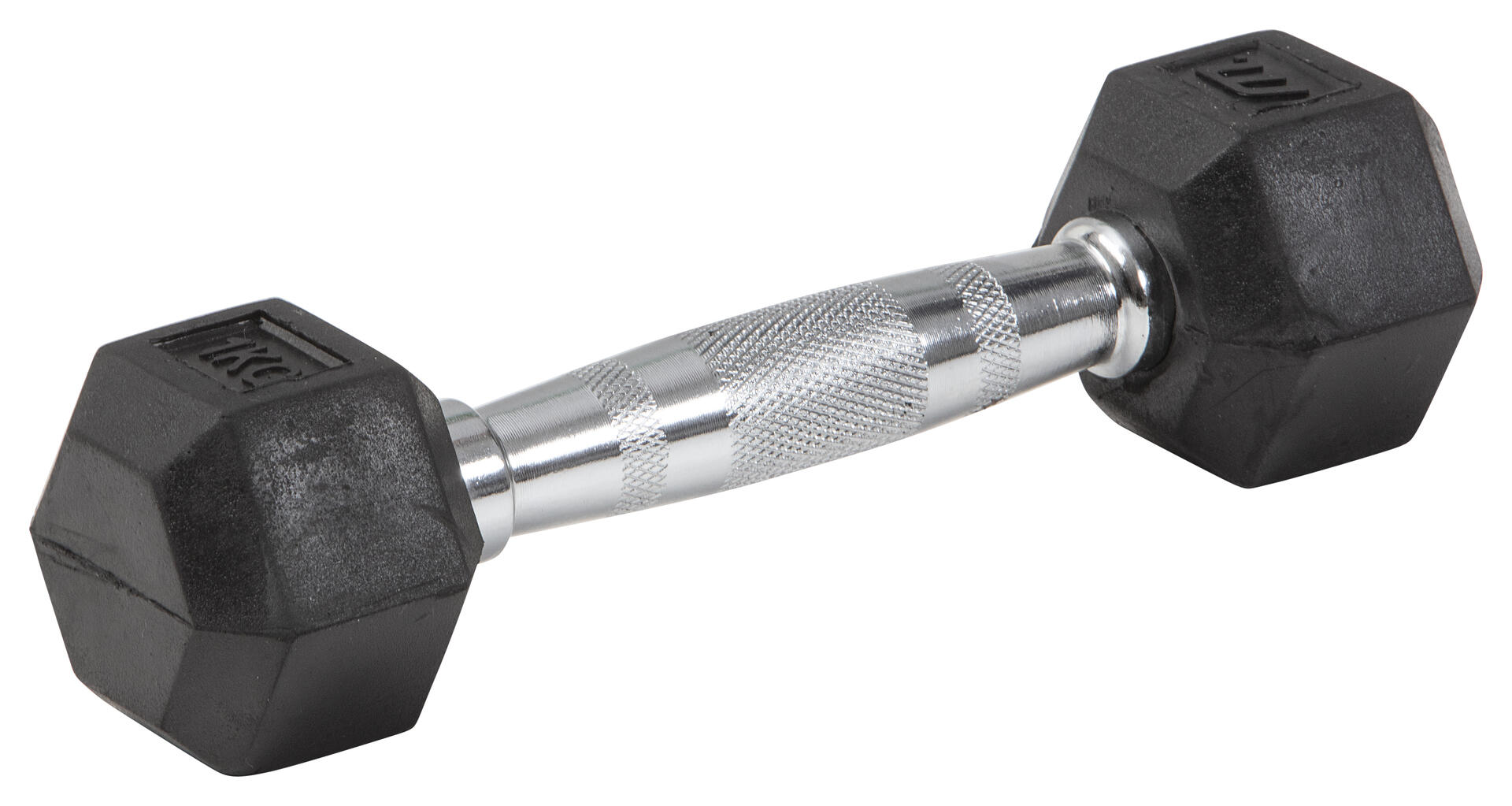 1st/fp. Kromat grepp med enkel lettring för bra grepp. Gummiklädda ändar skonar underlaget. Sexkantig form gör att hanteln ligger still. Vikt: 1 kg. Längd: 230 mm.