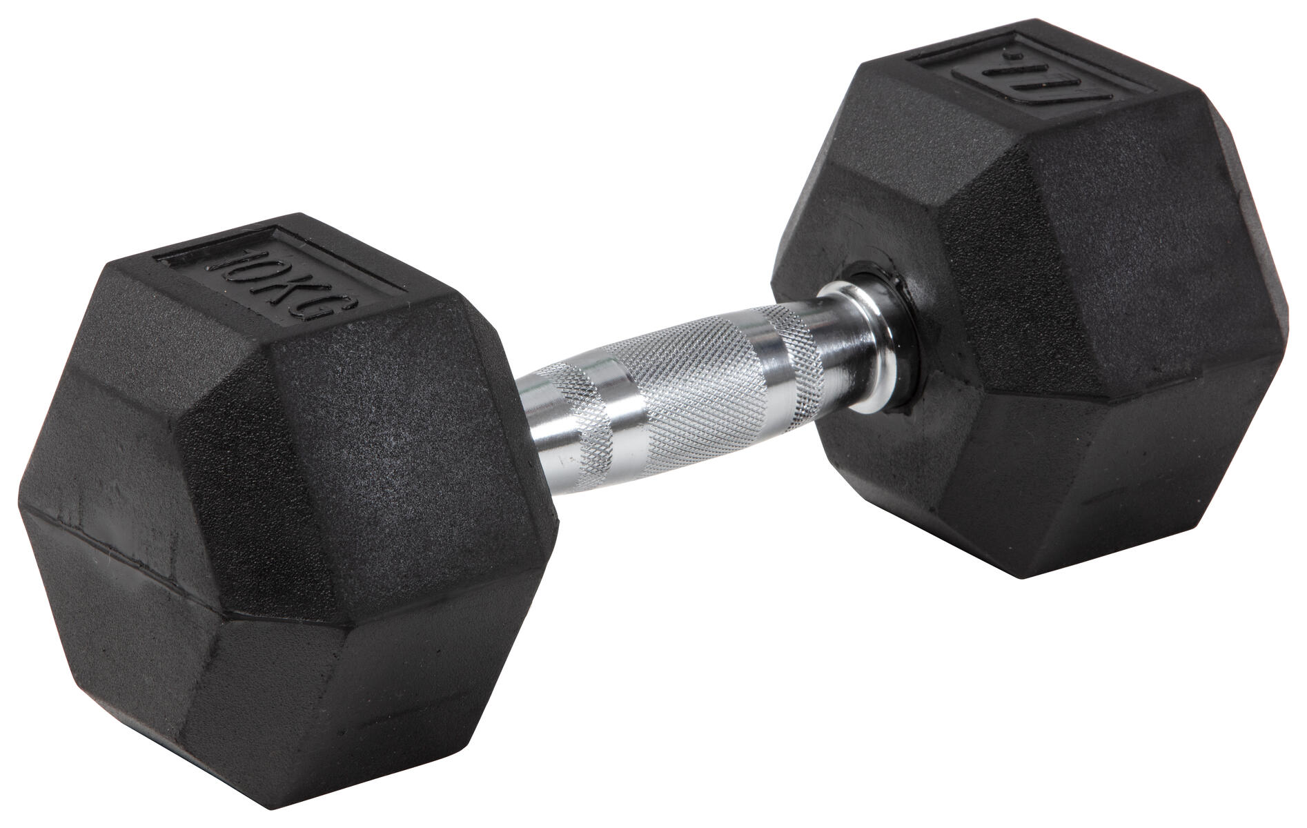 1 st/fp. Kromat grepp med enkel lettring för bra grepp. Gummiklädda ändar skonar underlaget. Sexkantig form gör att hanteln ligger still. Vikt: 10 kg. Längd: 320 mm.