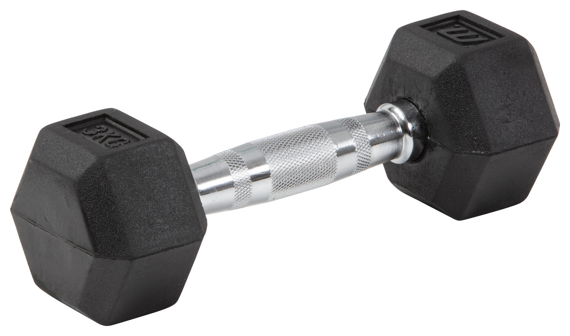 1st/fp. Kromat grepp med enkel lettring för bra grepp. Gummiklädda ändar skonar underlaget. Sexkantig form gör att hanteln ligger still. Vikt: 3 kg. Längd: 250 mm.
