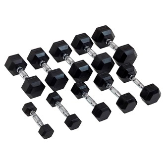 10 st/fp. Klassiska hantlar har blivit mer och mer populära, tack vare att de är både prisvärda samt mycket användbara. Hantlarna har kromade grepp som har en enkel lettring för att ge användaren ett bra grepp under träningen. Ändarna är gummiklädda vilket skonar underlaget samt den sexkantiga formen gör att hantlarna ligger still och även kan användas som grepp när man exempelvis ska göra traditionella armhävningar. Vikterna 1-10 kg.